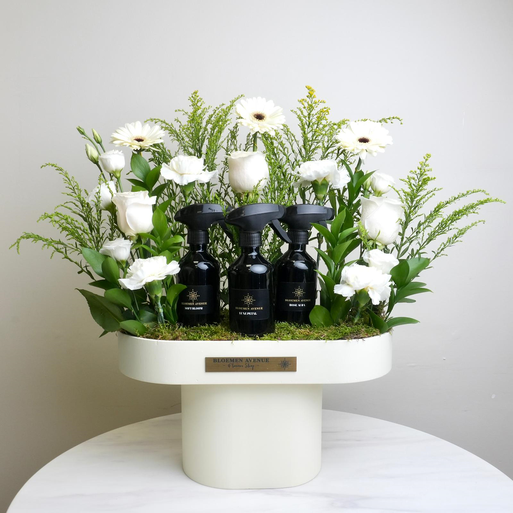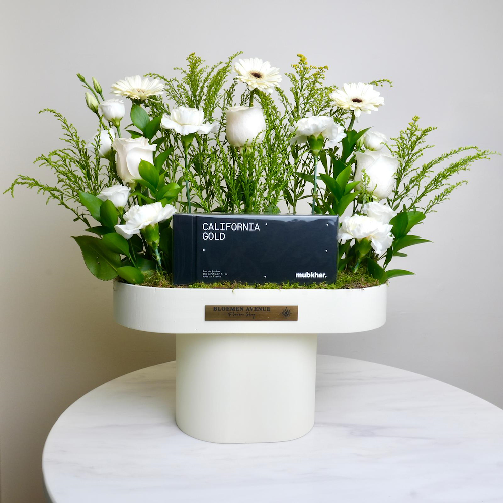 سلة من الماربل تحتوي على زهور البيبي جوري، اليوستوما، الكرنيشن والجربيرا مع بوكت النقود. ملاحظة: المنتج لا يشمل النقود.