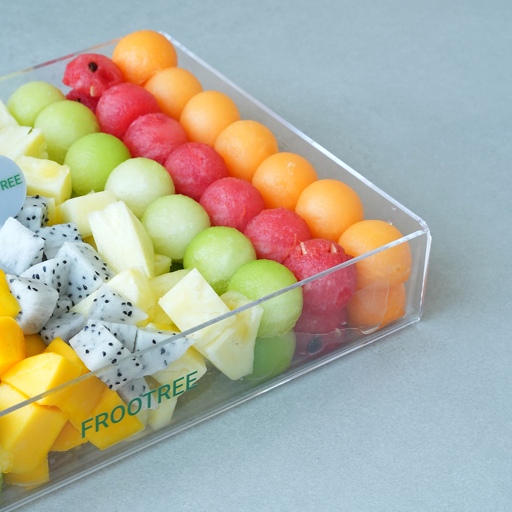 A fruit platter featuring a mix of fruits including watermelon melons mango dragon fruit pineapple and other seasonal fruits, beautifully arranged in a tray measuring 30 by 20 cm, some fruits may be replaced by others depending on seasonal availability.