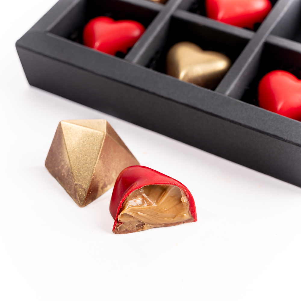 This chocolate box contains: - 3 assorted milk chocolates. - 3 assorted red chocolates. A bold blend of passion and tradition. 6 handcrafted truffles, 3 creamy milk chocolates, and 3 striking crimson-glazed delights, presented in a sleek black gift box with gold detailing. A 72g masterpiece of modern indulgence.