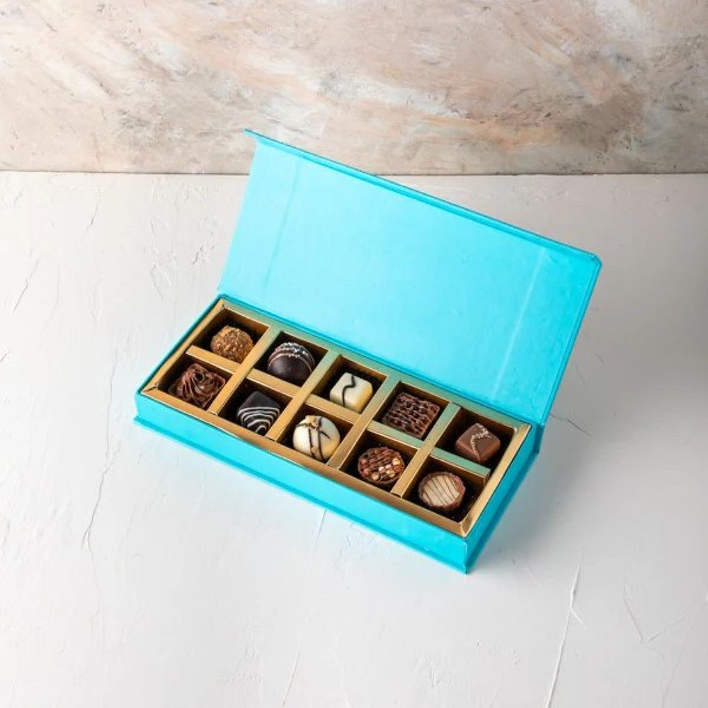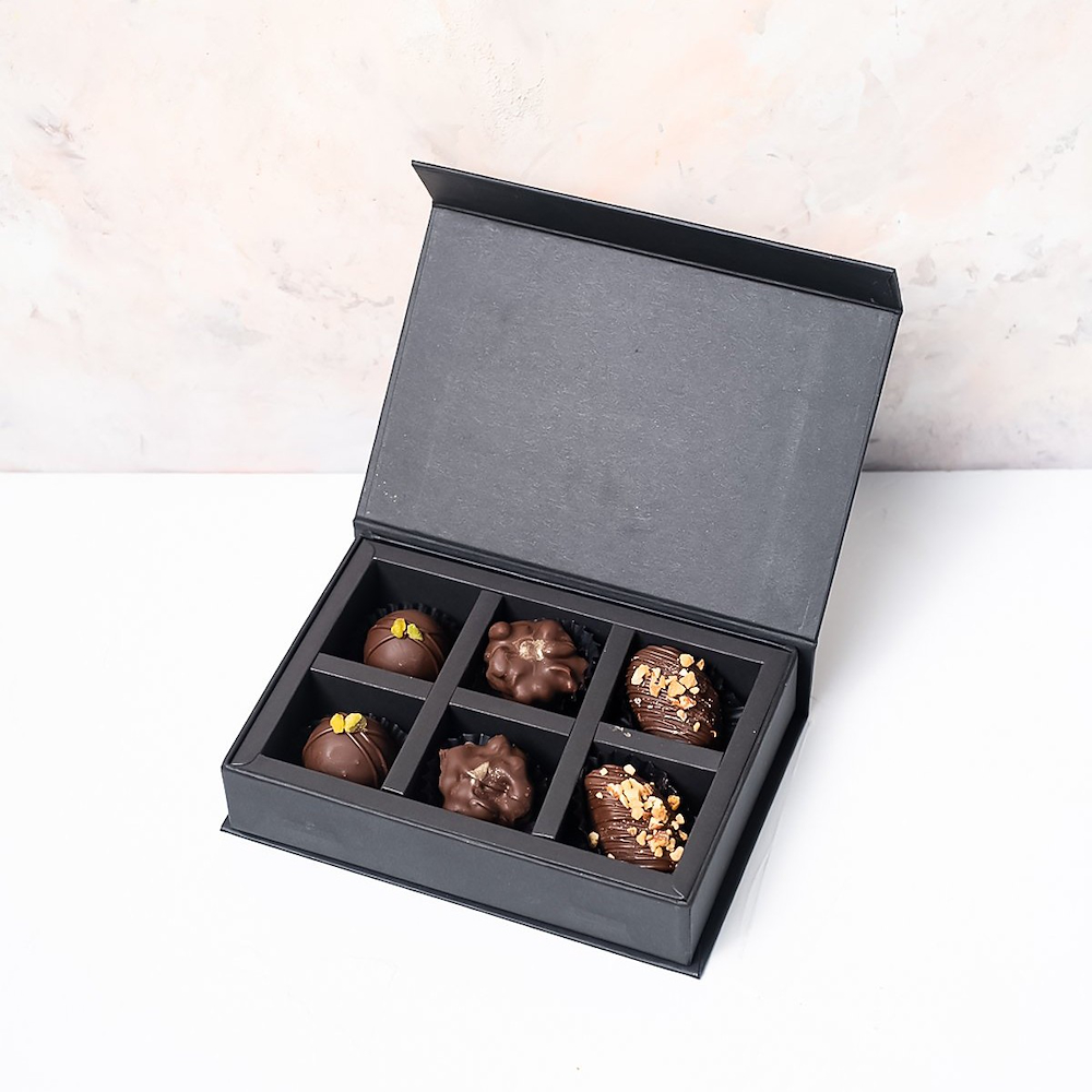 A gift box featuring 6 assorted Belgian chocolate truffles with rich fillings, including hazelnut, Nutella, Lotus, peanut butter, pistachio, caramel, Biscoff, and roasted nuts. Keep away from direct heat and sunlight, and store in a cool, dry place. Suitable for vegetarians and prepared in a facility where nuts are used.
