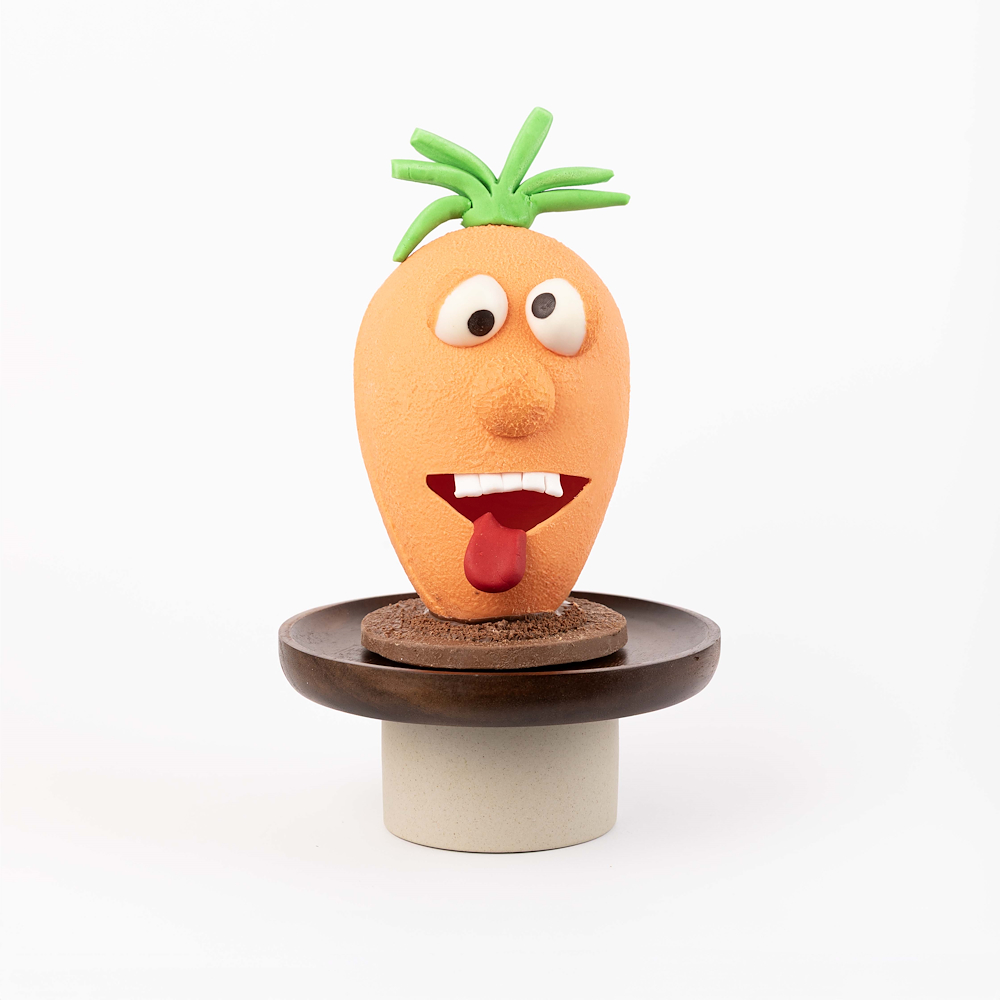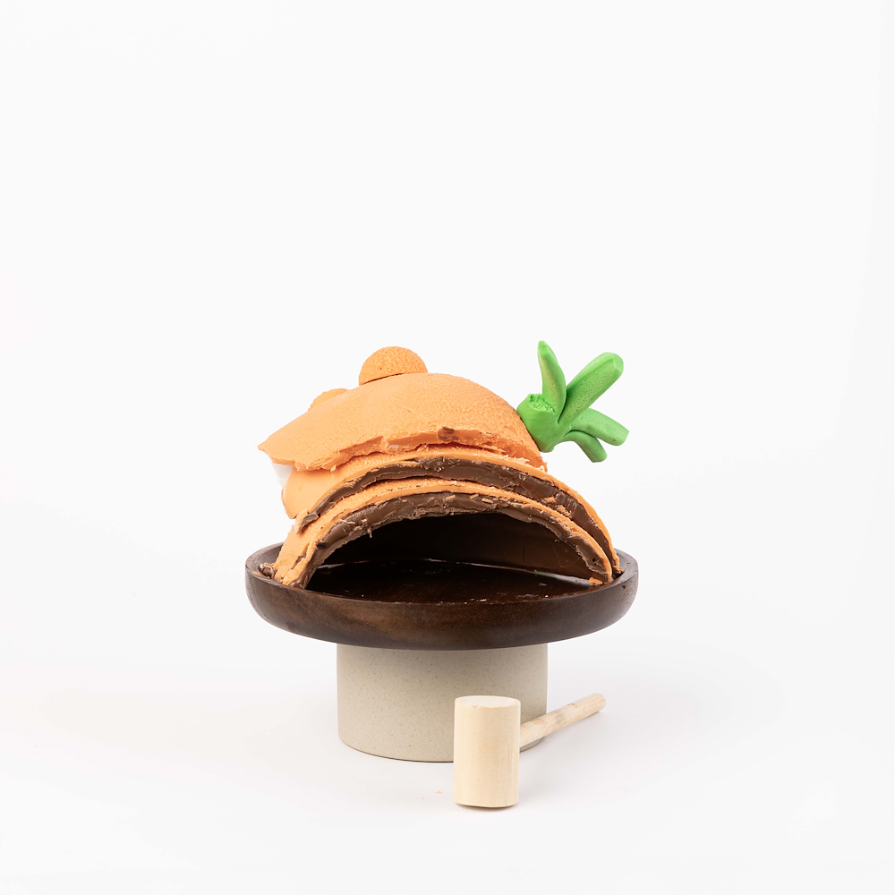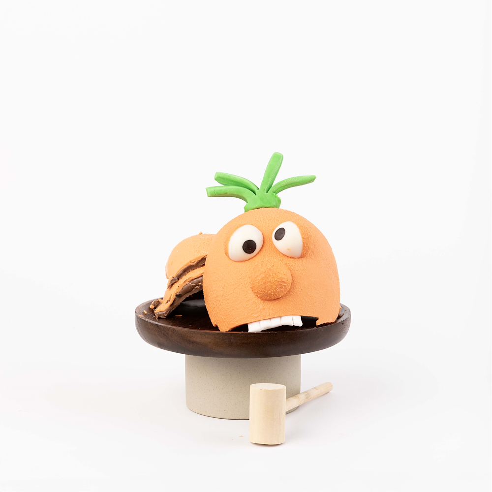 A 3D carrot egg chocolate smash featuring 600 g of rich chocolate, presented in a 16×16×27 cm box and includes one hammer. the truffle flavors inside are pistachio, hazelnut, peanut, speculoos, caramel, and rocher.
