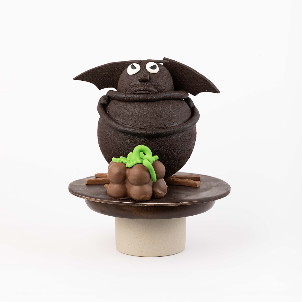 A frog-shaped smash chocolate, suitable for Halloween gatherings, and comes with a hammer. Chocolate weight: 700g. Chocolate size: 15 x 15 x 23 cm. Box size: 21 x 21 x 25 cm. Fillings: pistachio, hazelnut, peanut, speculoos, caramel, and roche.