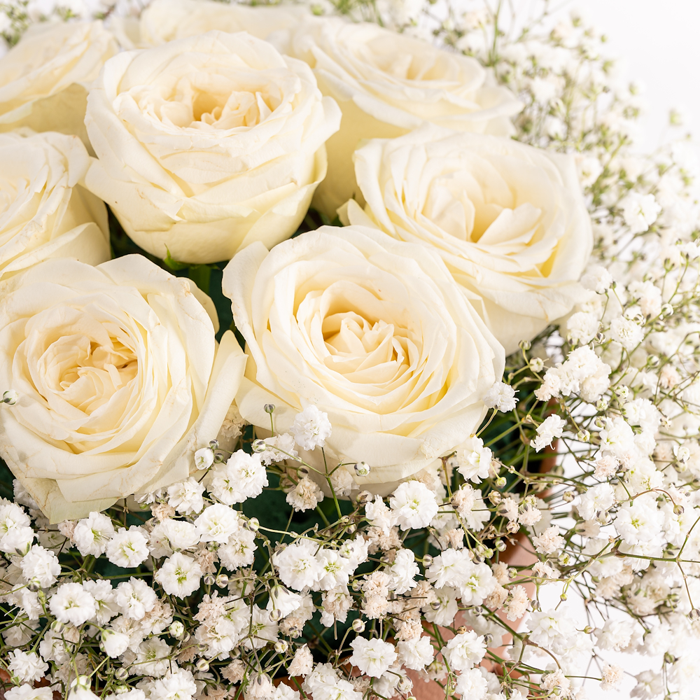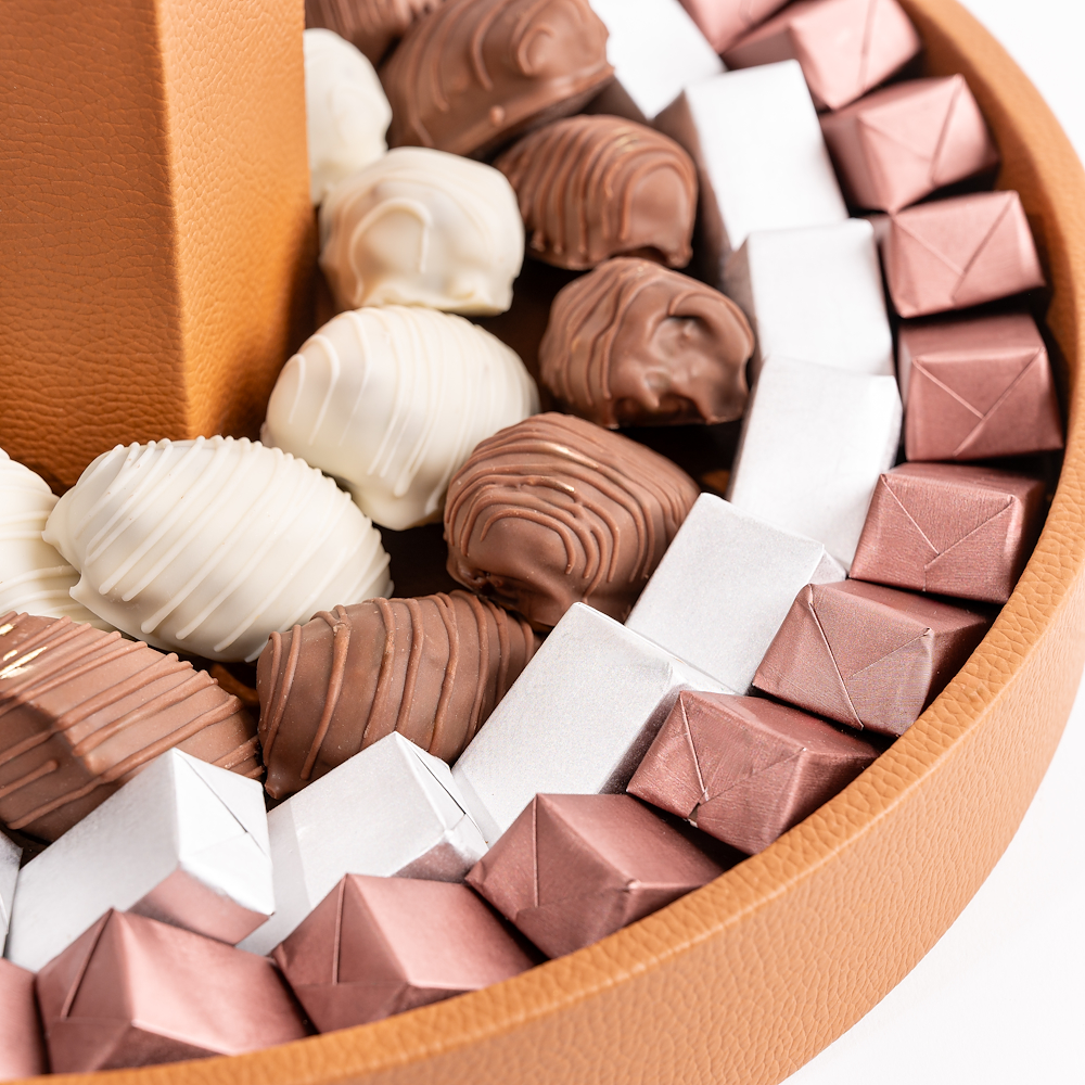 This tray contains: - 9 assorted white chocolate–covered dates. - 15 milk chocolate–covered dates. Total dates weight: 550g. - 54 assorted milk & dark chocolates. Total chocolate weight: 900g. A statement of generosity elevated to art, this collection is an exquisite gifting centerpiece designed for the most distinguished Ramadan and Eid occasions. Comes with a floral arrangement of roses and gypsophila.