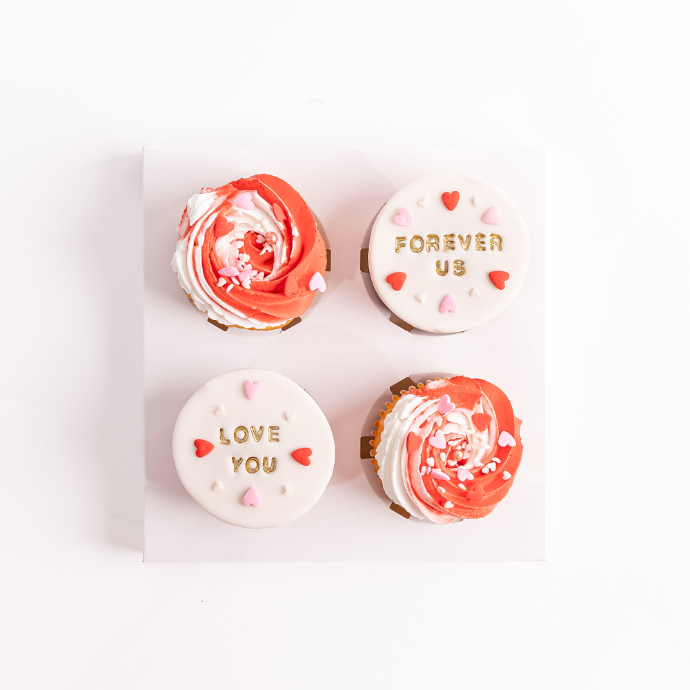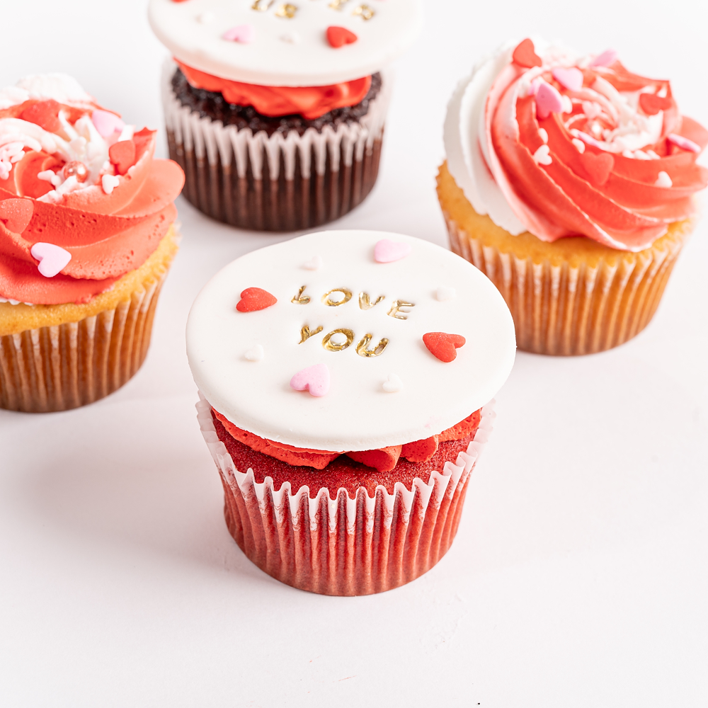 A set of 4 valentine cupcakes featuring 2 vanilla and 2 chocolate bases, topped with piped frosting, fondant messages, and red and white rosette swirls for a sweet and elegant gift.