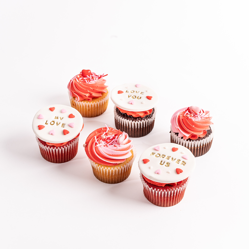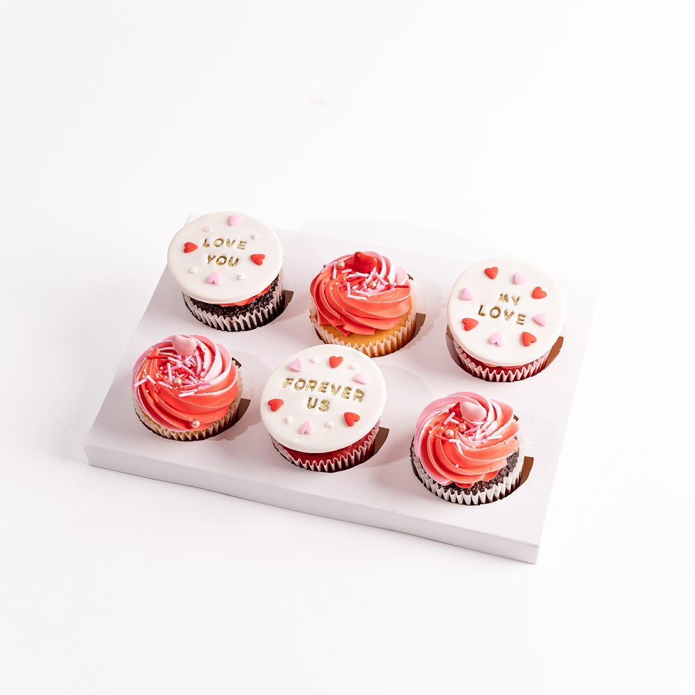 A set of 6 valentine cupcakes featuring 2 vanilla, 2 chocolate, and 2 red velvet bases, topped with handcrafted buttercream, fondant messages, and elegant rosette swirls for a luxurious celebration.