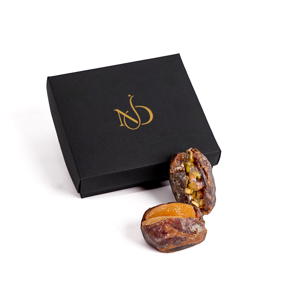 This elegant box includes 2 pistachio-stuffed dates and 2 apricot-stuffed dates, made with naturally sweet, high-quality dates and generously filled with select ingredients. Rich in flavor and beautifully presented.