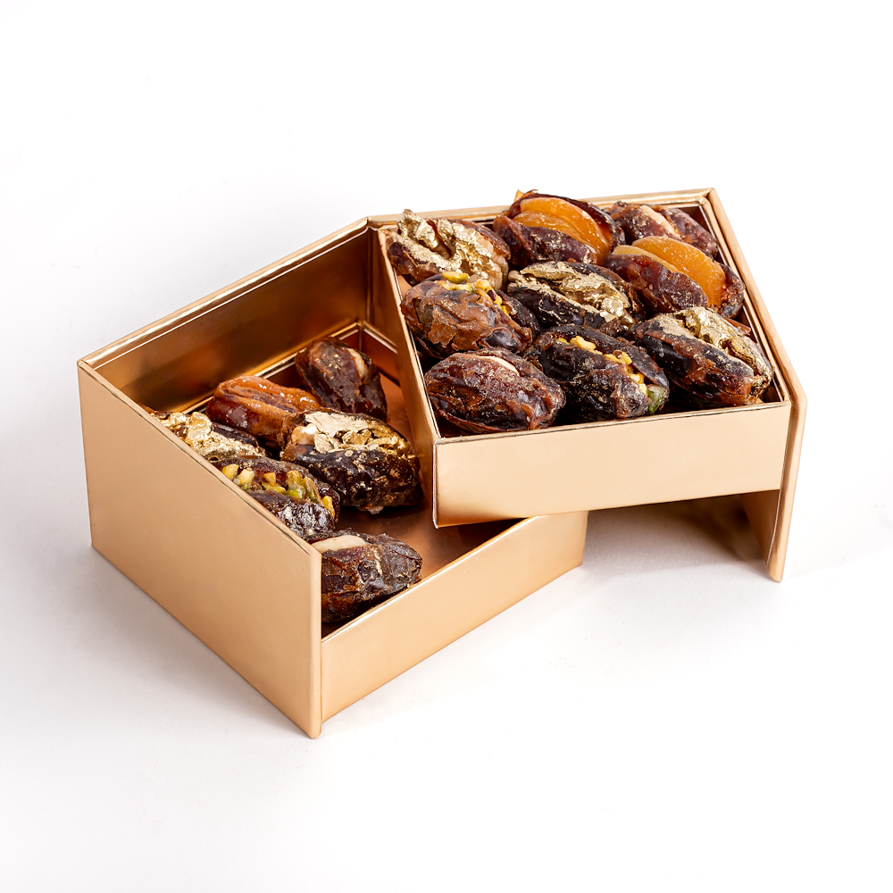 This tray includes: - 4 cashew-stuffed dates. - 4 pistachio-stuffed dates. - 4 apricot-stuffed dates. - 6 walnut-stuffed dates. A refined celebration of tradition, this collection is perfect for distinguished Ramadan and Eid gifting.