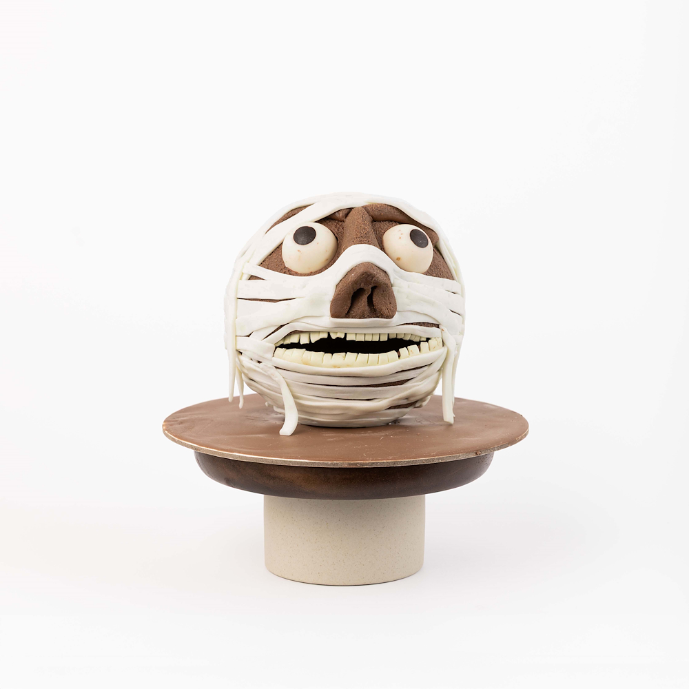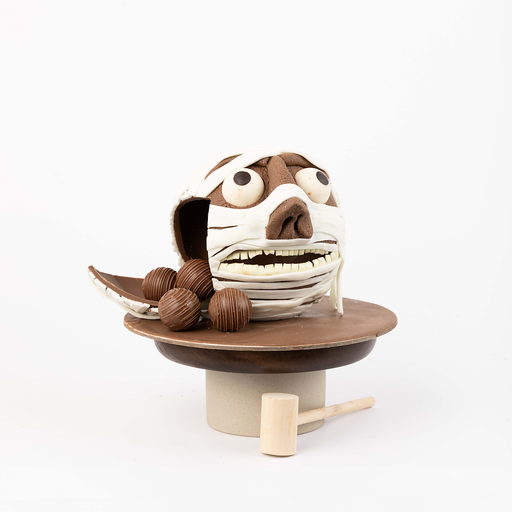 A 3D mummy chocolate smash featuring 400 g of rich chocolate, presented in a 16×16×25 cm box and includes one hammer. the truffle flavors inside are pistachio, hazelnut, peanut, speculoos, caramel, and rocher.