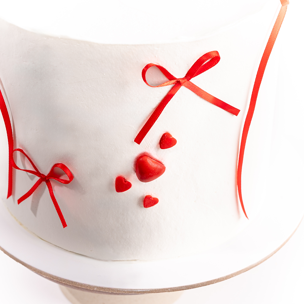 A 1kg cake featuring chocolate, vanilla, or red velvet, available as a signature designer cake with elegant ribbons and hearts or a fresh fruit cake topped with seasonal berries, made as a luxurious centerpiece for special celebrations.