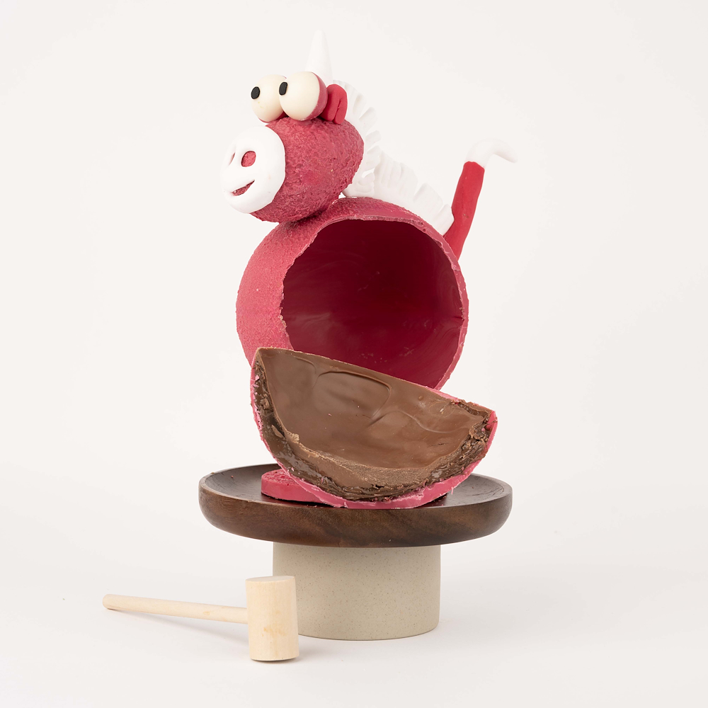 A 3D pink unicorn horse-shaped smash chocolate, suitable for Halloween gatherings, and comes with a hammer. Chocolate weight: 700g. Chocolate size: 13 x 19 x 24 cm. Box size: 16 x 16 x 27 cm. Fillings: pistachio, hazelnut, peanut, speculoos, caramel, and roche.