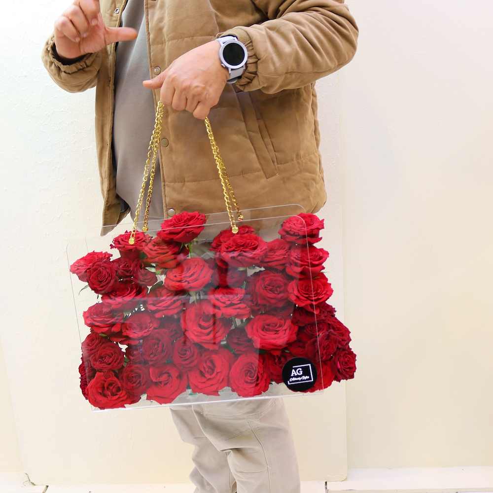 A luxurious acrylic bag flower arrangement featuring 25 red roses, enhanced with baby roses for an elegant and romantic look. Perfect for Love Day, anniversaries, proposals, and special occasions, with flower delivery available across the UAE.