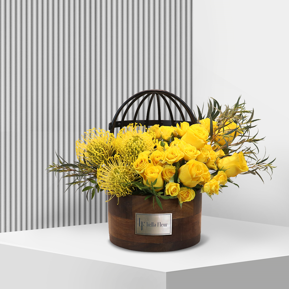 A bouquet containing roses, baby roses, and proteas, arranged beautifully in a box. Suitable for any occasion.