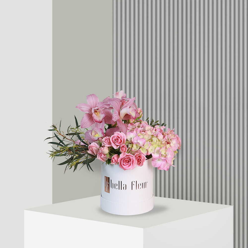 Pink flowers are a way to show respect and admiration for the people receiving the gift. This composition goes even further, adding themes of innocence and grace into the bouquet. It consists of roses, hydrangeas and orchids, all pink in color. Saddle touches of green are made with fresh green foliage.
