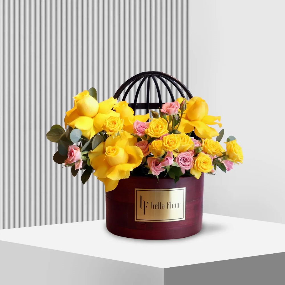 A bouquet containing roses and baby roses, arranged beautifully in a box. Suitable for any occasion.