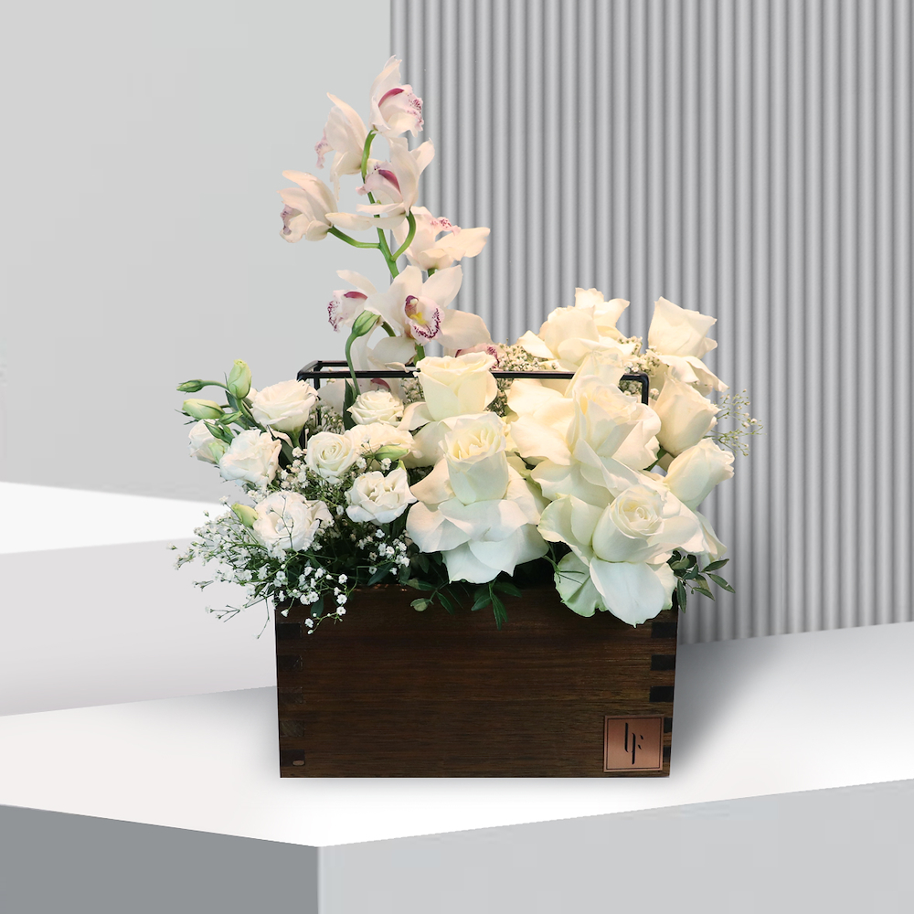 A bouquet containing roses, baby roses, and cymbidiums, arranged beautifully in a box. Suitable for any occasion.