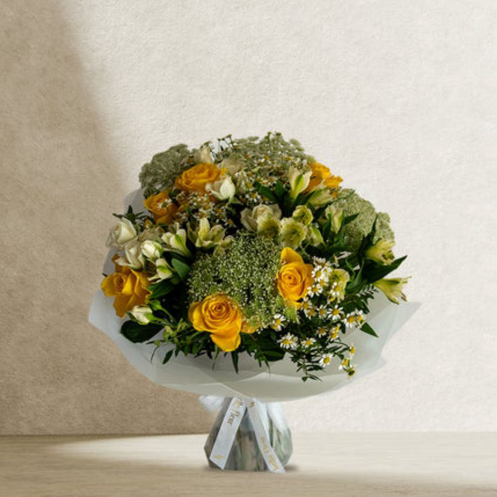 An elegant bouquet featuring roses and alstroemeria flowers.