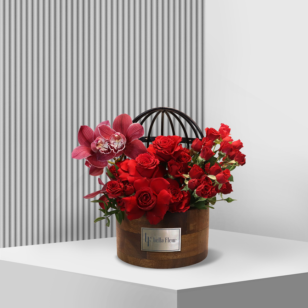 An exquisite blend of rich red roses and elegant orchids, beautifully arranged in a charming birdcage design. This unique composition exudes sophistication, making it the perfect gift for romantic occasions, birthdays, or any celebration. With same-day delivery in Dubai and expert florist consultations, Bella Fleur ensures a seamless gifting experience. Elevate your gesture with this enchanting arrangement, crafted to leave a lasting impression at the best price.