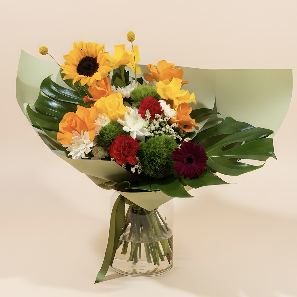 An elegant vase that contains roses, chrysanthemums, gerberas, carnations and sunflowers.