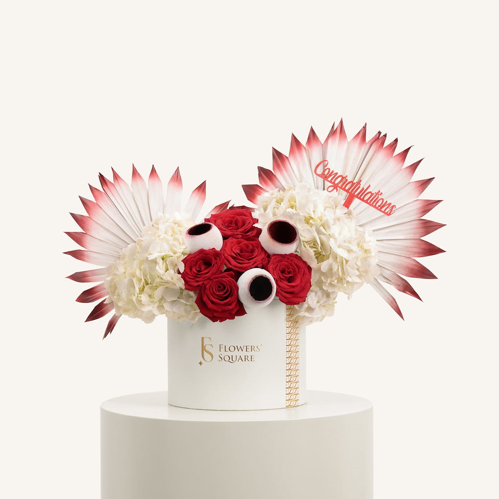 Experience the ultimate gift of love with this special bouquet! Our combo includes a cuddly teddy bear, a box of beautiful red roses, and delicious Patchi chocolates. Perfect for expressing your passion and admiration for someone special. Give the gift of love and make their day unforgettable.