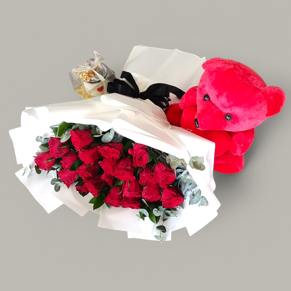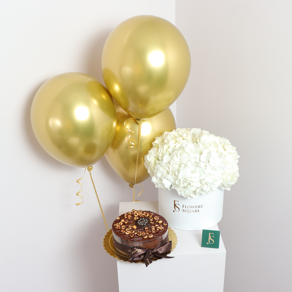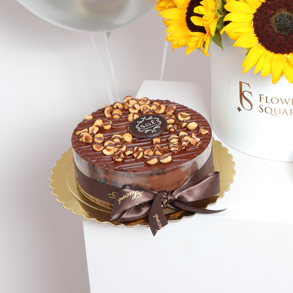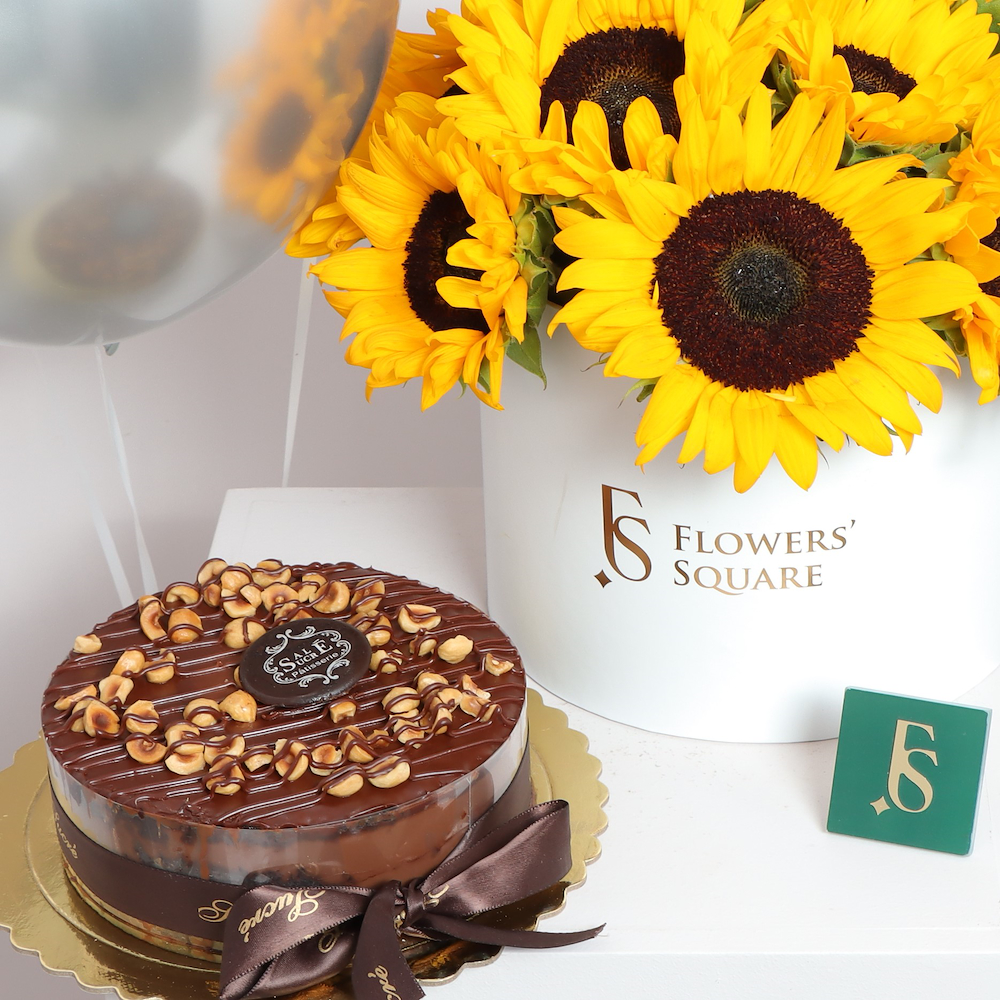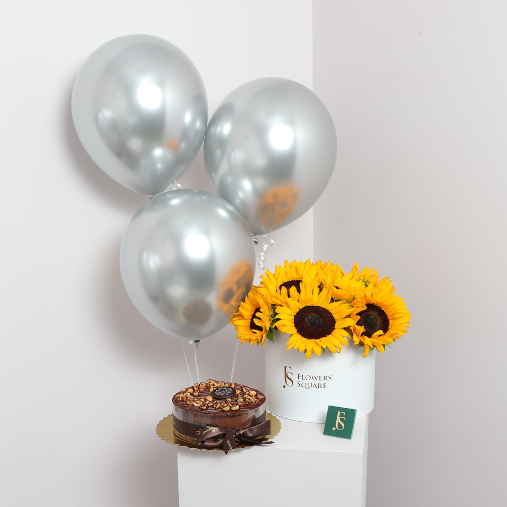 Surprise your loved ones with a special bouquet of sunflowers, hazelnut fudge cake, and 3 silver helium balloons are sure to make your special occasion unforgettable. Crafted with the best ingredients, the sweet and creamy taste of the hazelnut fudge cake will tantalize your taste buds while the silver helium balloons create an ethereal atmosphere. Let us make your celebration memorable.