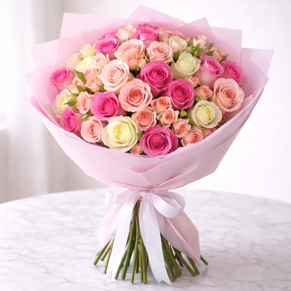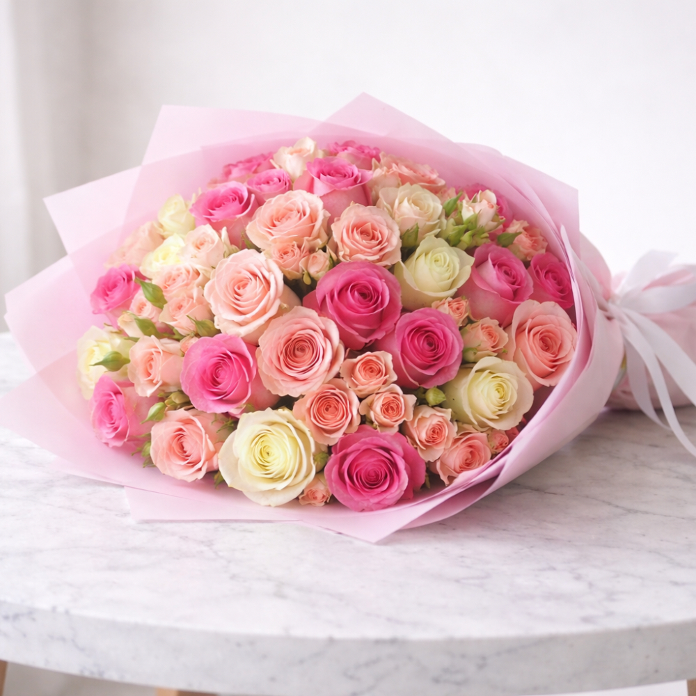 A beautifully hand tied bouquet featuring 30 fresh rose stems paired with 10 delicate baby rose stems, thoughtfully arranged in a harmonious mix of soft and vibrant tones.