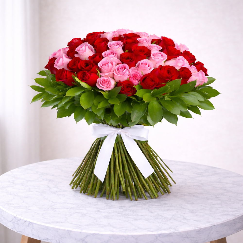 A grand floral arrangement featuring 100 roses in elegant pink and red shades. Carefully hand-arranged to create a full and luxurious look, this design is presented without wrapping, highlighting the natural beauty of each rose. Perfect for expressing love, celebration, or making a truly unforgettable statement on any special occasion.