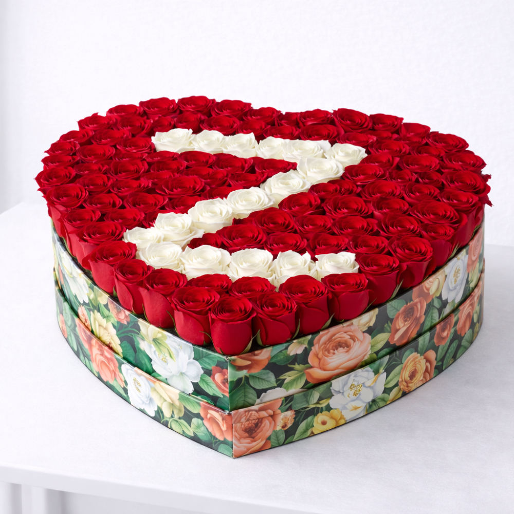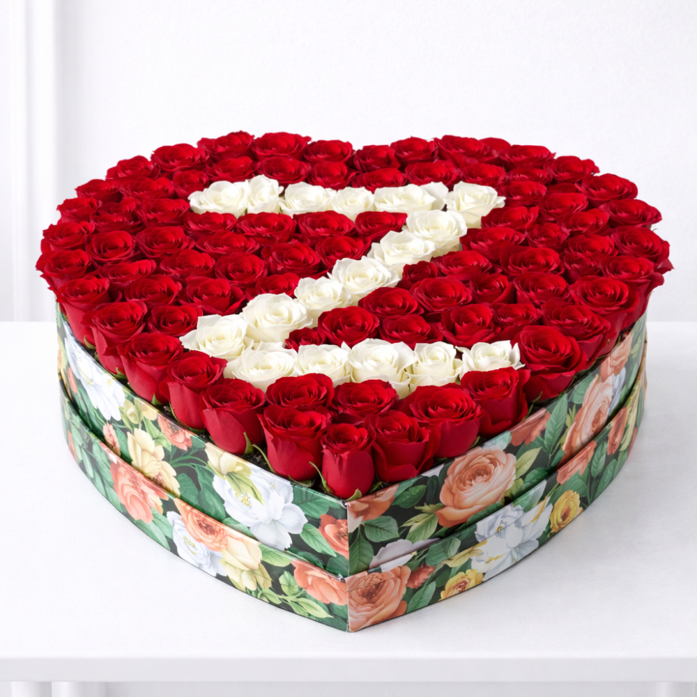 A stunning heart-shaped floral arrangement featuring 100 premium red roses, elegantly designed with a custom white rose letter inside the heart. Presented in a colorful heart-shaped box, this personalized design adds a meaningful and romantic touch, making it the perfect gift for uniquely expressing love.