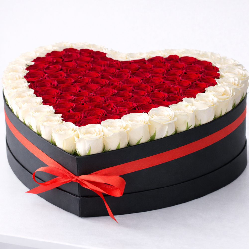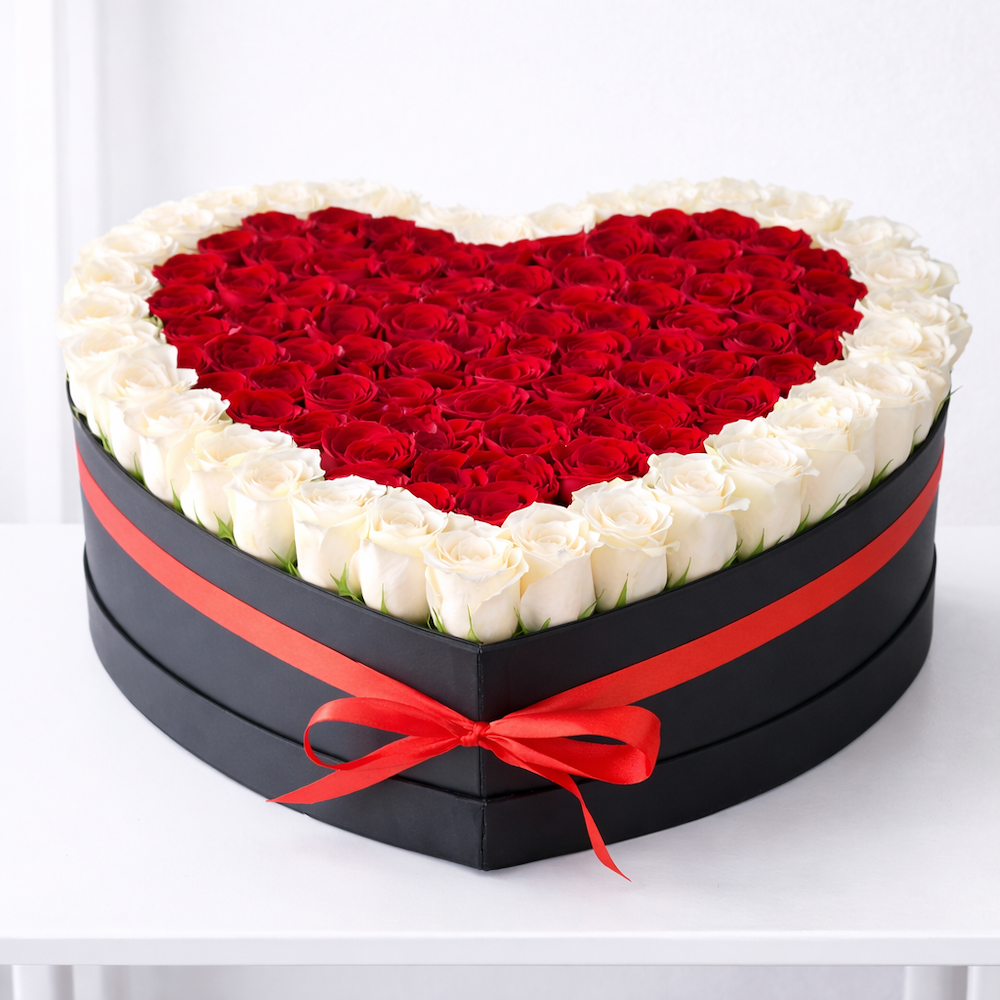 A stunning and romantic arrangement of 100 fresh roses, featuring red roses at the center beautifully framed with a border of elegant white roses, all arranged in a luxurious heart-shaped black box. This unique design creates a striking contrast that symbolizes deep love, purity, and elegance. perfect for love day, anniversaries, engagements, or any special romantic occasion where you want to make an unforgettable impression.