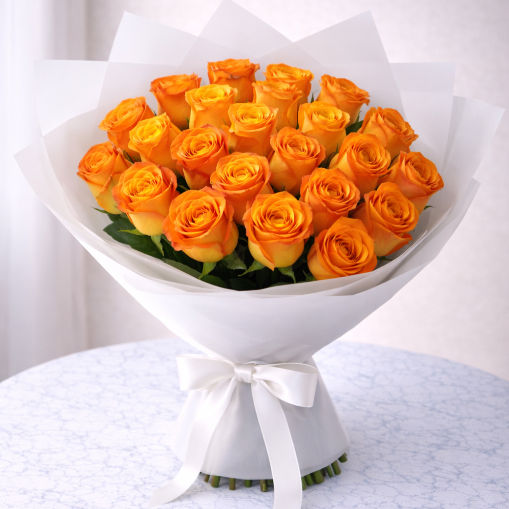 A vibrant bouquet of 20 orange roses, beautifully arranged and wrapped in elegant white paper with a classic ribbon finish. The bright orange roses symbolize energy, joy, and warmth, making this bouquet a perfect choice for birthdays, celebrations, congratulations, and special occasions.
