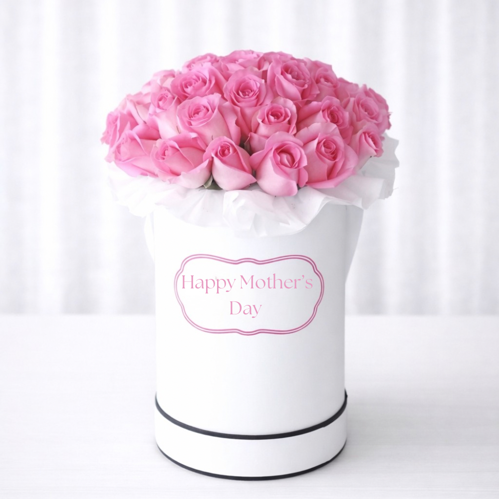 A soft and elegant arrangement of 30 pink roses, beautifully presented in a standard white round box. This customized floral box is perfect for Mother’s Day, with the option to add a personalized message to express love, gratitude, and appreciation in a meaningful way.