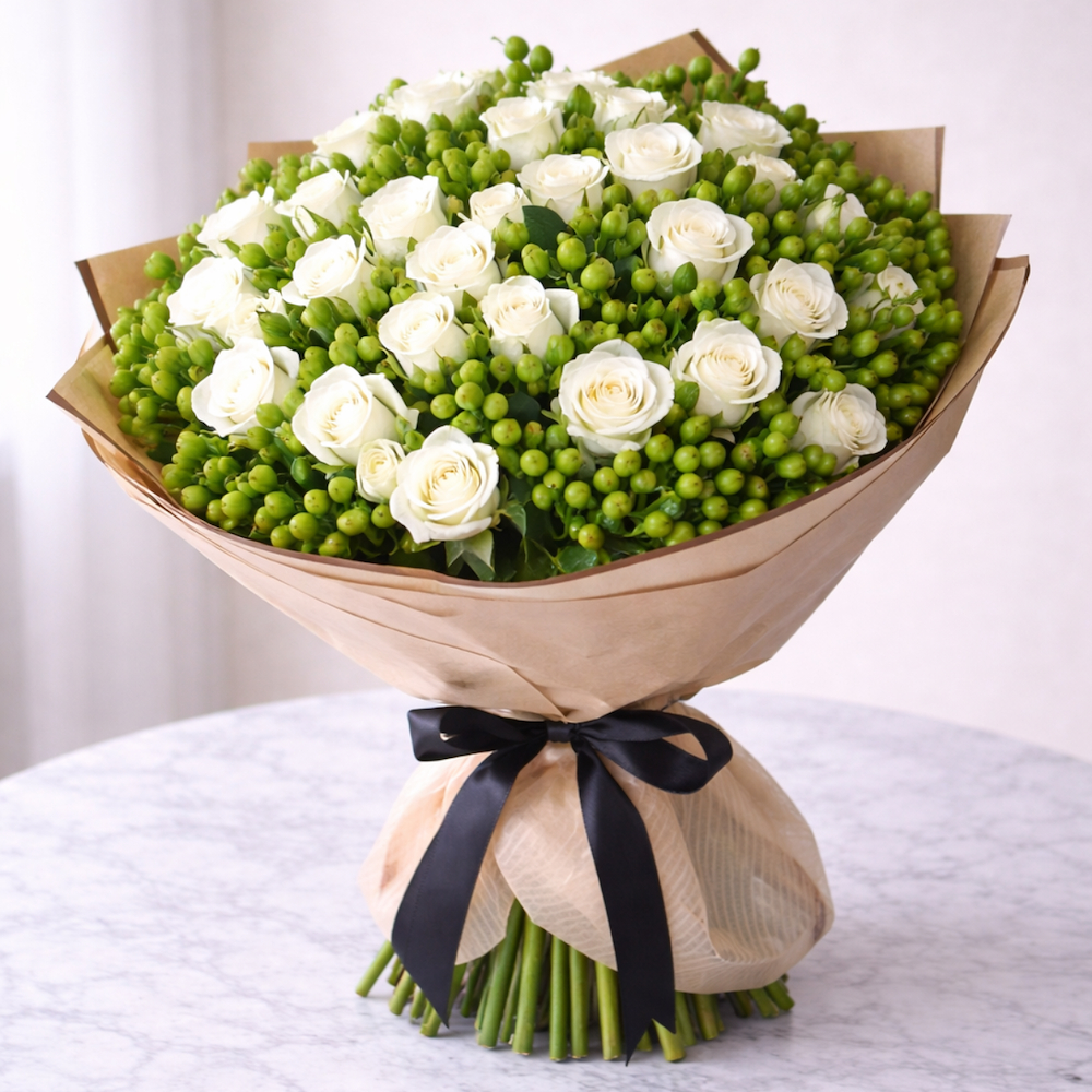A refined arrangement of white roses and delicate baby roses, beautifully accented with lush green berries. This elegant bouquet reflects purity, calm, and timeless beauty, making it an ideal choice for weddings, congratulations, sympathy gestures, and sophisticated occasions.