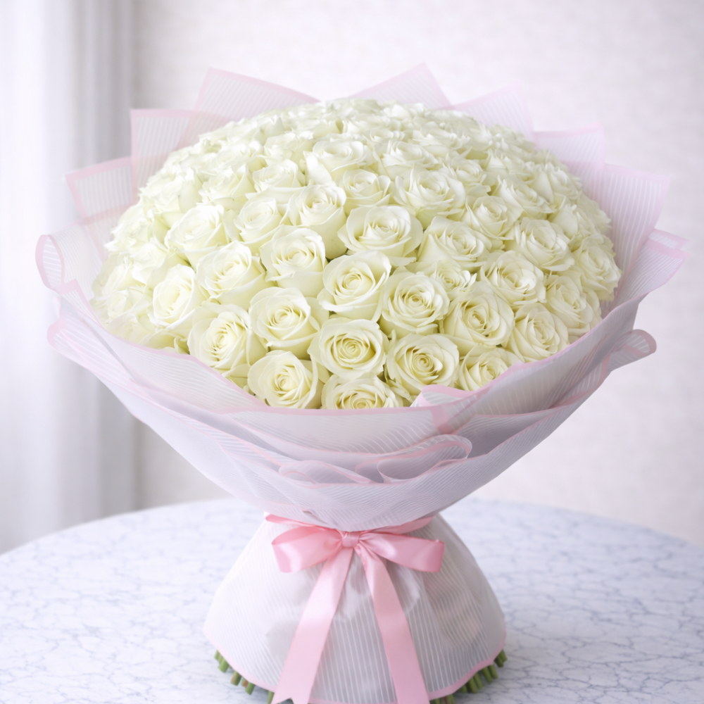 An elegant hand-tied bouquet featuring 50 white roses, beautifully wrapped to create a soft and timeless look. This classic arrangement symbolizes purity, peace, and sincerity, making it a perfect choice for weddings, congratulations, sympathy, or any refined occasion.