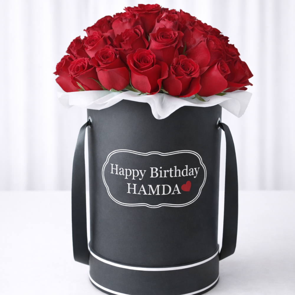 A timeless arrangement of 30 red roses presented in an elegant black round box. This standard-size box features carefully arranged red roses, creating a bold and romantic look that never goes out of style. Perfect for birthdays, love occasions, anniversaries, or as a classic gesture of affection.
