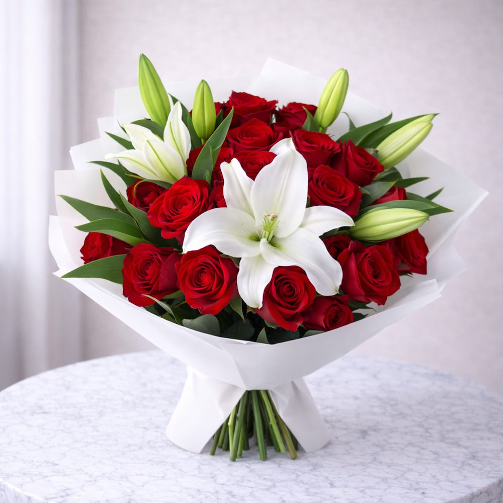 A beautiful bouquet featuring 18 red roses paired with 2 elegant white lilies, carefully arranged with lush green foliage. This timeless arrangement symbolizes love, elegance, and admiration, making it perfect for romantic occasions, anniversaries, birthdays, and heartfelt celebrations.