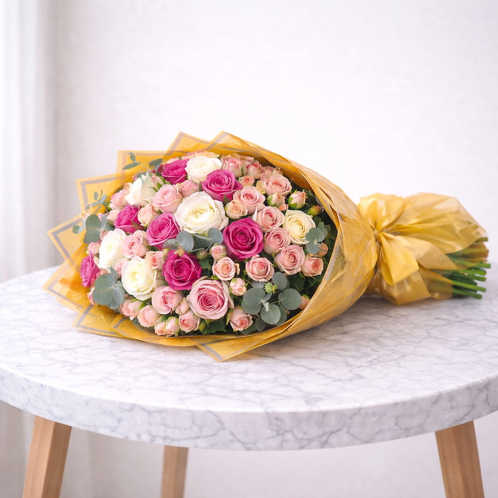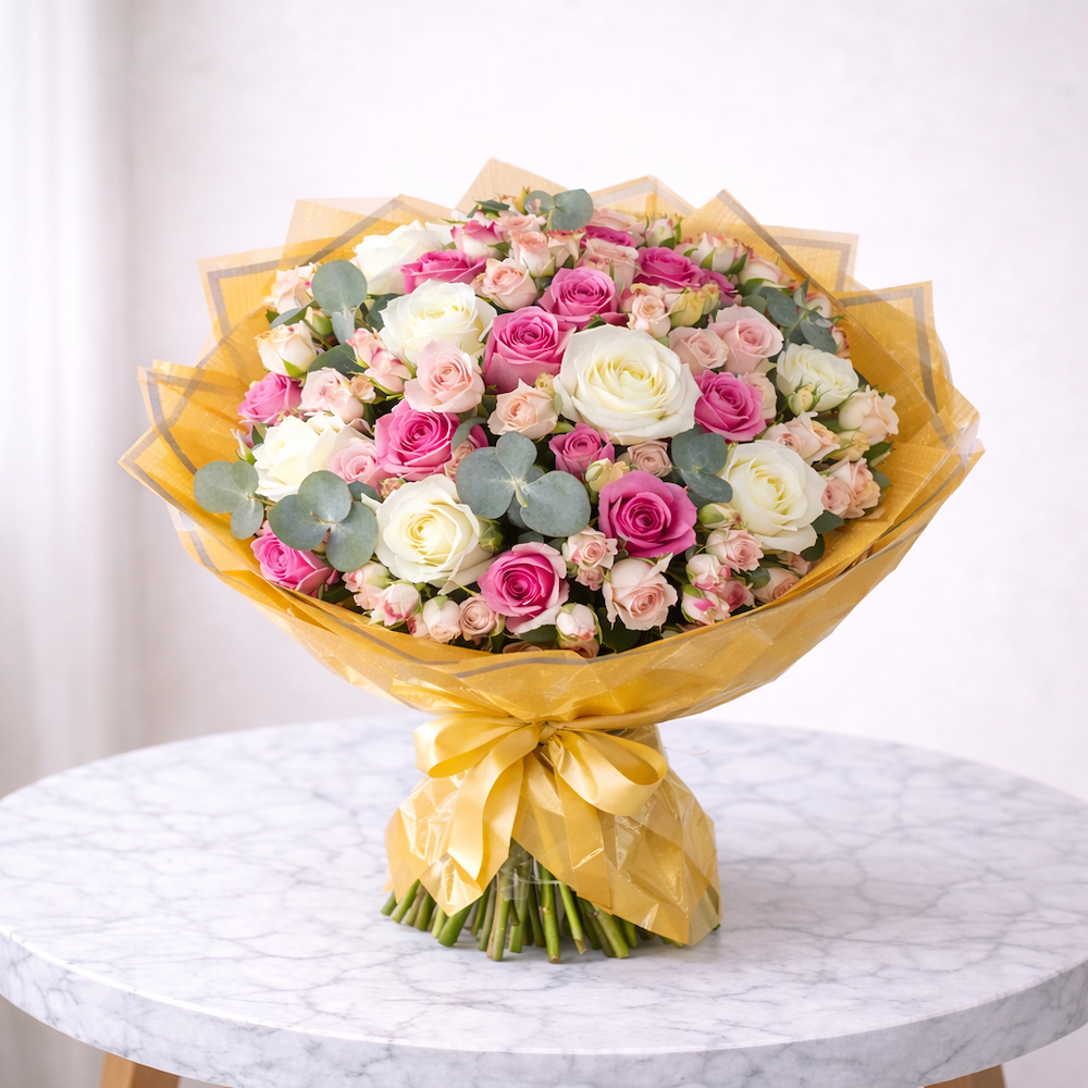 A beautifully arranged standard hand-tied bouquet featuring 30 roses and 20 baby roses, designed in soft, light colors and complemented with fresh greenery. This elegant bouquet offers a gentle and charming look, making it a perfect gift for birthdays, congratulations, thank you gestures, or any special occasion.