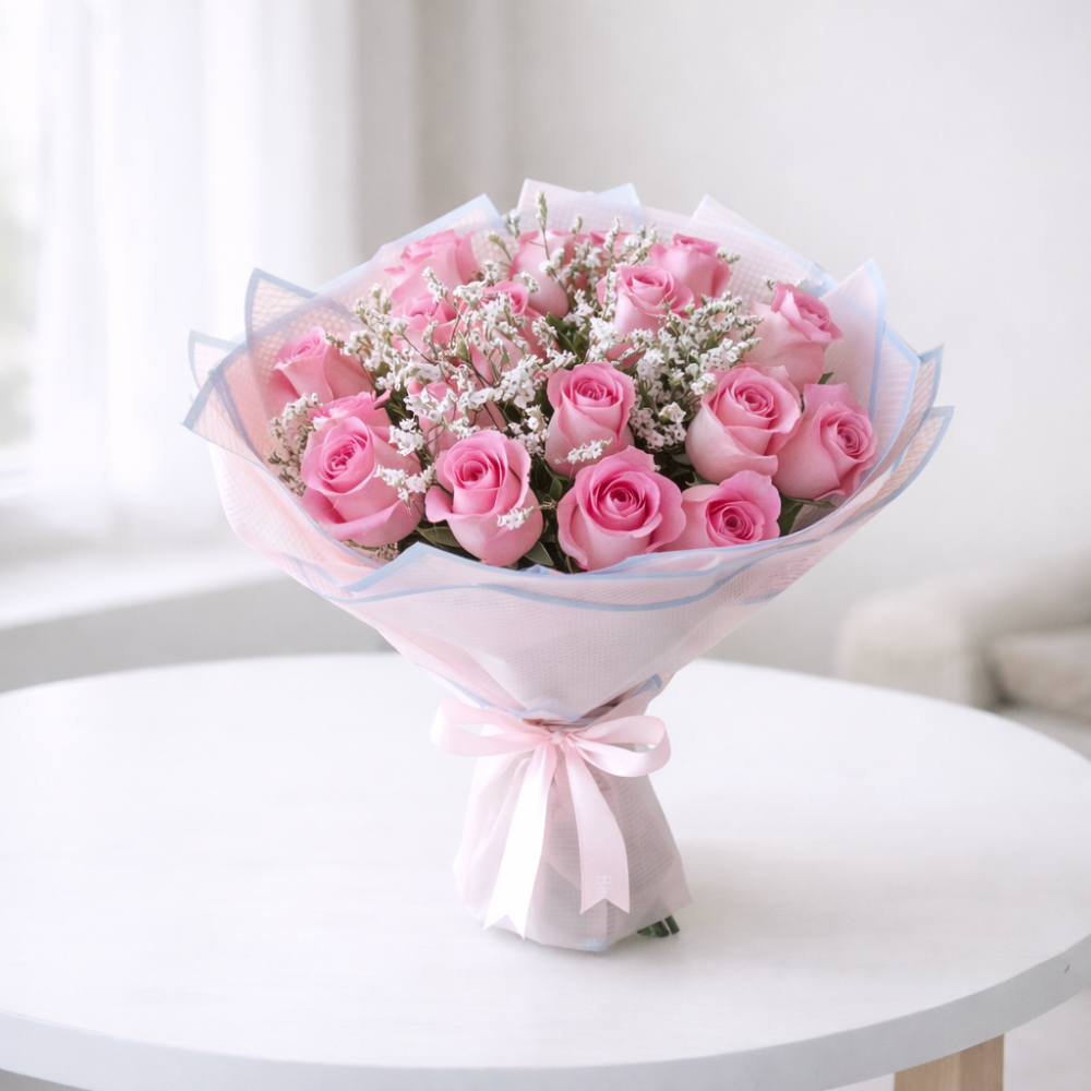 A charming bouquet of 20 pink roses, beautifully arranged with delicate filler flowers and wrapped in elegant pastel paper. This soft and romantic bouquet is perfect for birthdays, anniversaries, congratulations, or simply to express love and appreciation. Carefully handcrafted to deliver freshness, beauty, and timeless elegance.