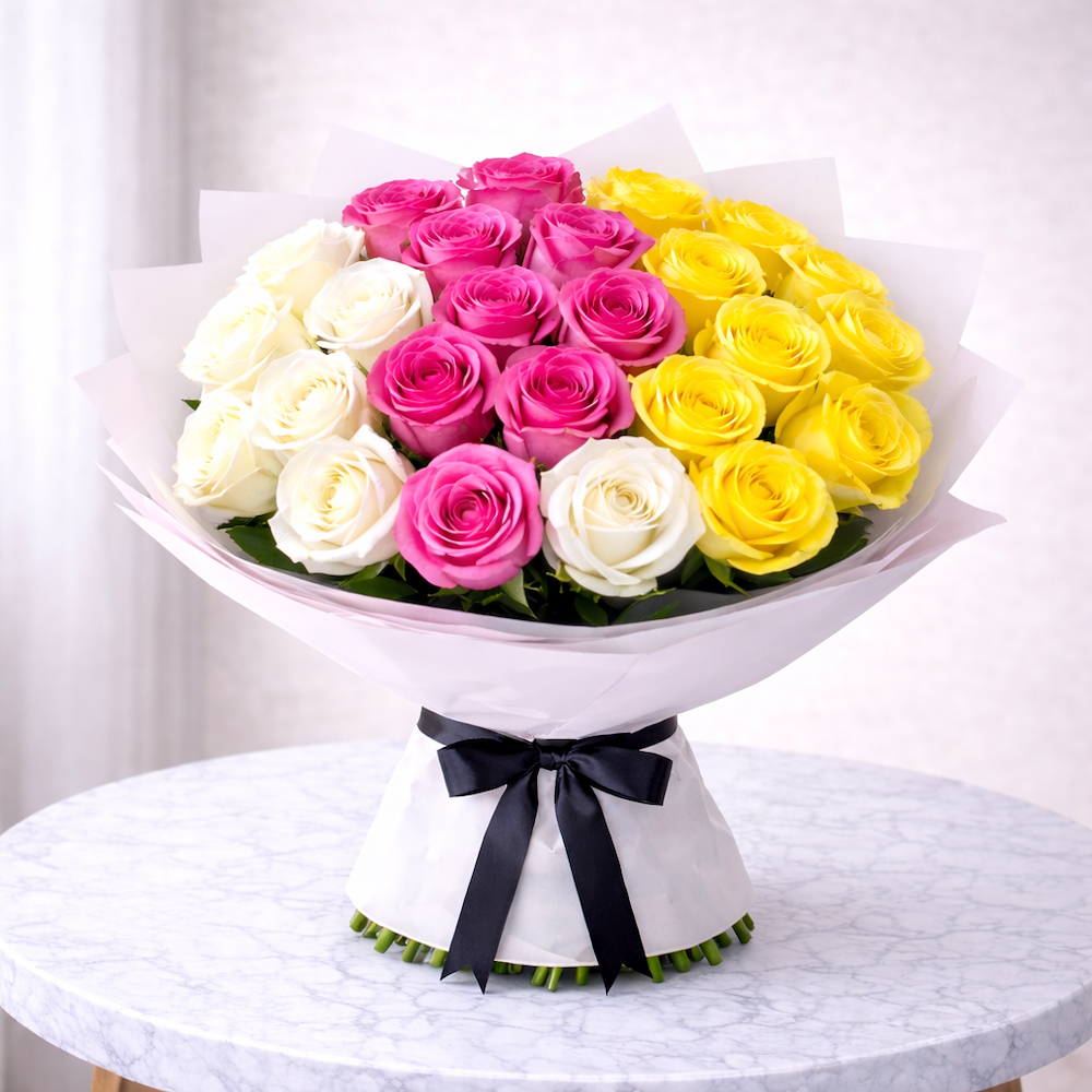 A cheerful and elegant bouquet featuring 24 roses in a beautiful mix of white, yellow, and pink colors. This spring-inspired arrangement brings brightness and warmth, making it perfect for birthdays, congratulations, get-well wishes, or simply to make someone smile. Carefully hand-tied and wrapped for a soft, joyful look.