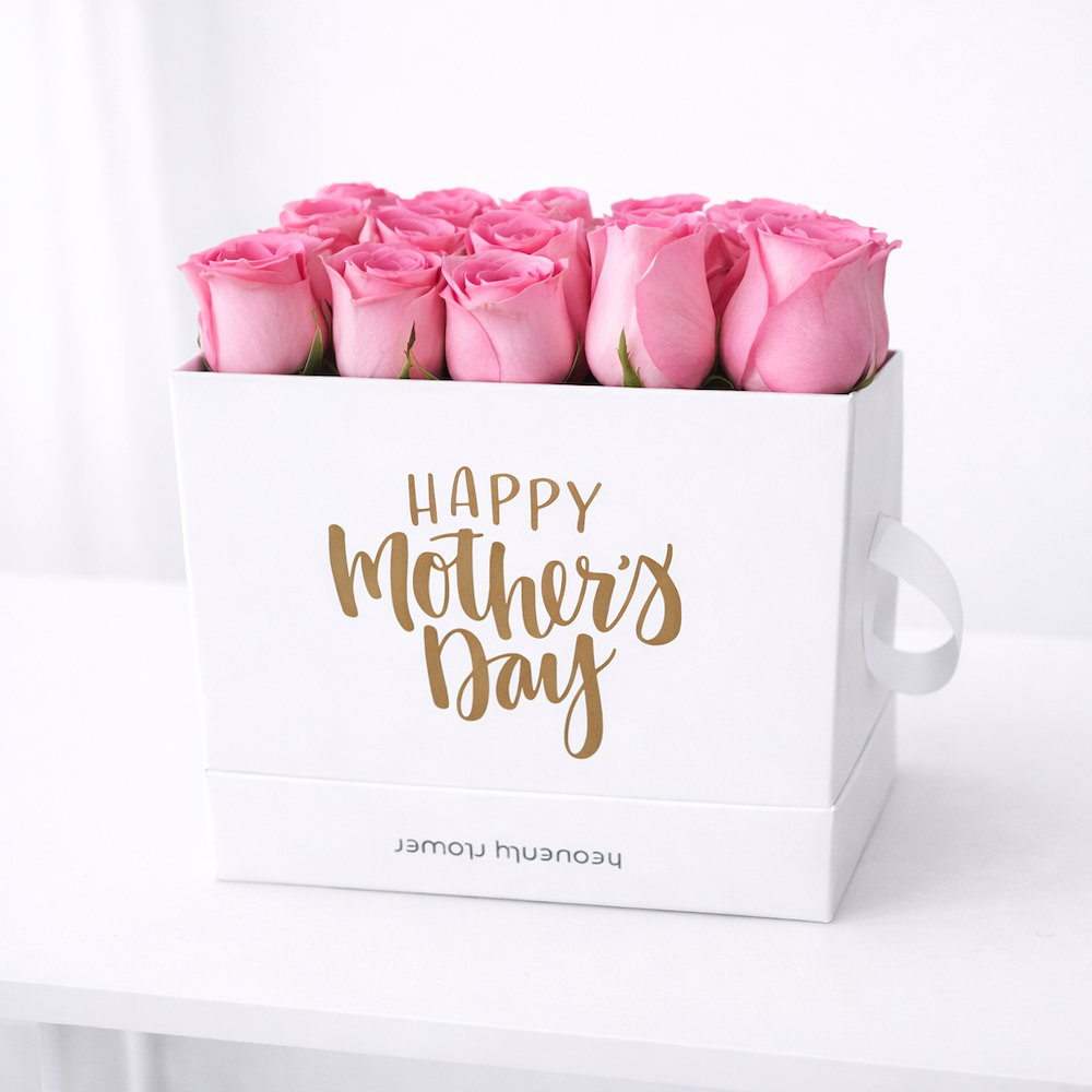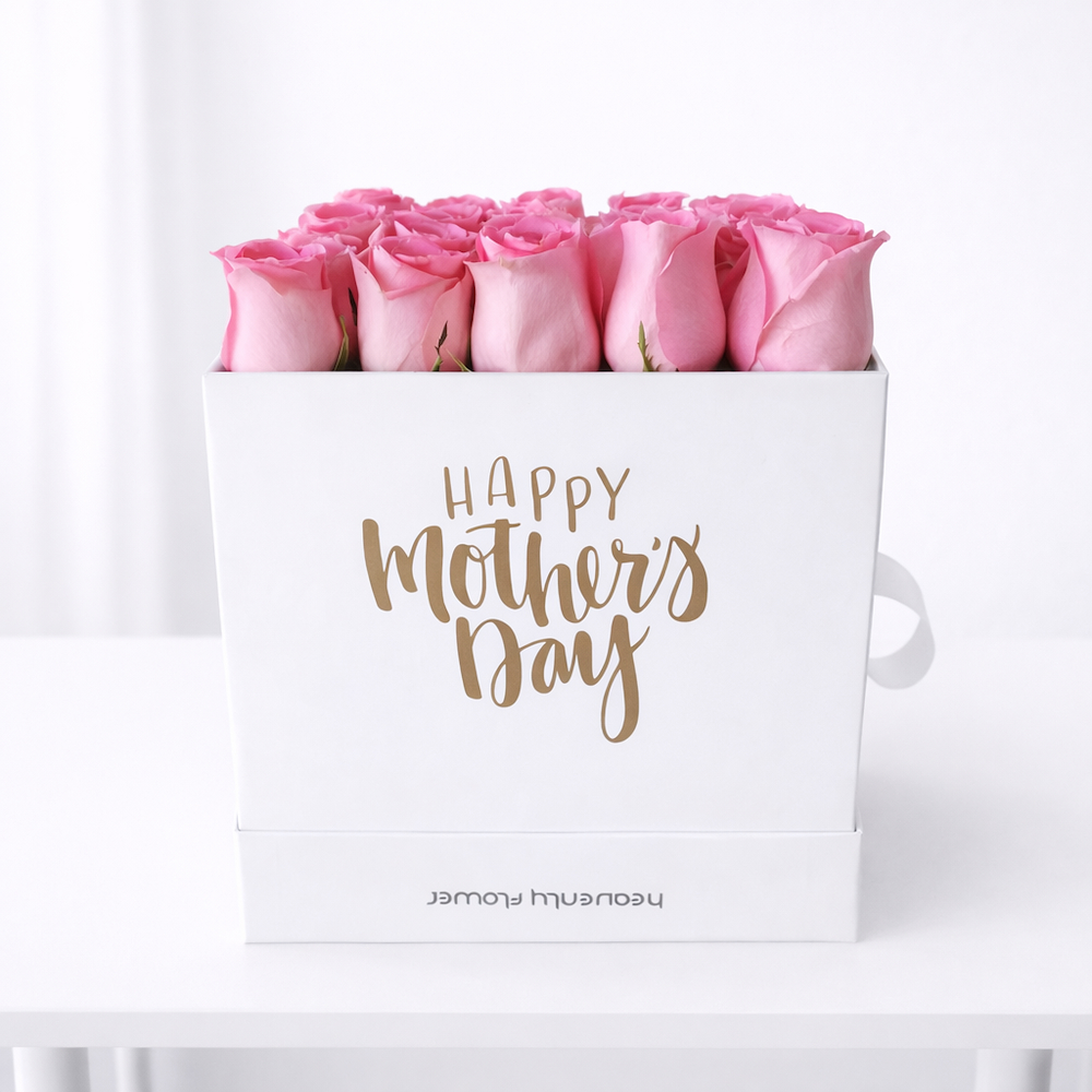 Freshly cut pink roses beautifully arranged in an elegant white box featuring a “Happy Mother’s Day” design. This standard size arrangement includes 25 pink roses and can be customized with a special message or name, making it a perfect gift to express love and appreciation on Mother’s Day.