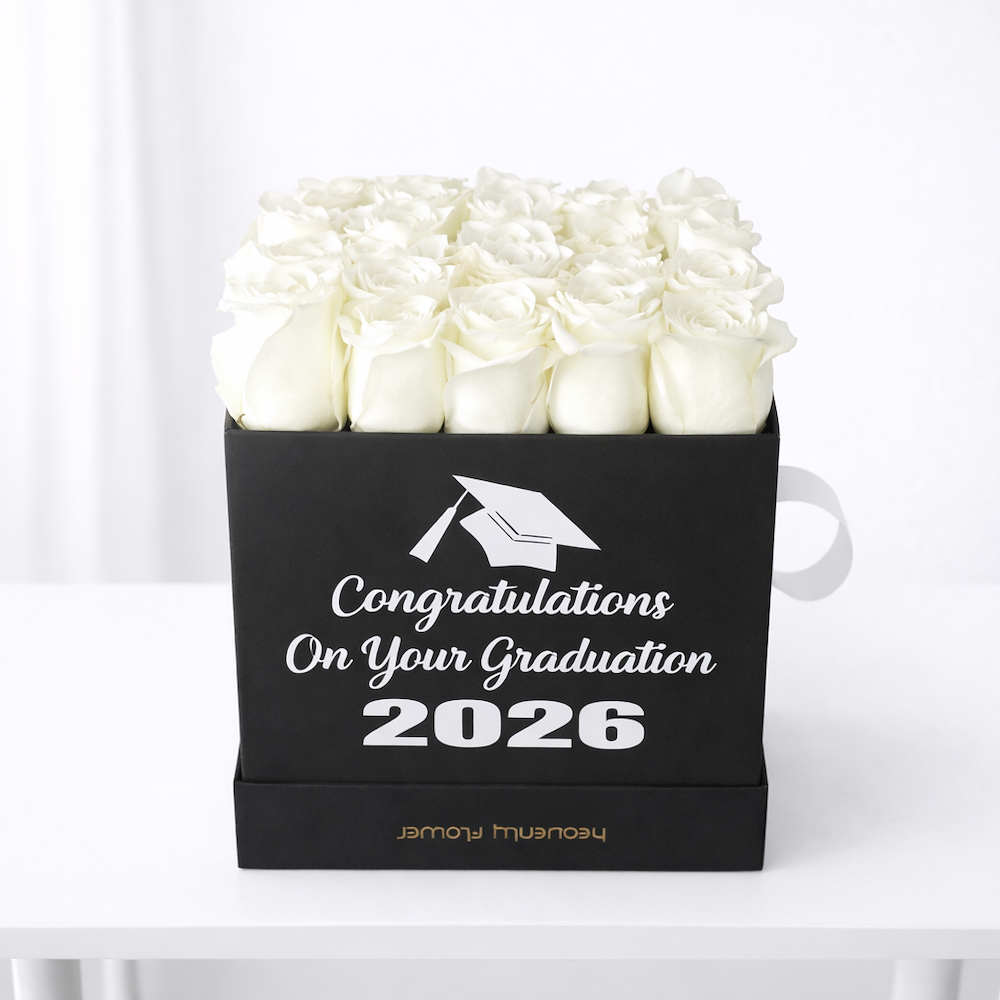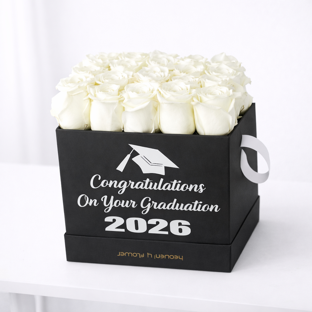 Freshly cut white roses elegantly arranged in a stylish black box, specially designed for graduation celebrations. this standard size arrangement includes 25 white roses and can be customized with a congratulatory message, name, or year, making it a refined and meaningful gift to celebrate success and achievement. perfect for graduation ceremonies and milestone celebrations.
