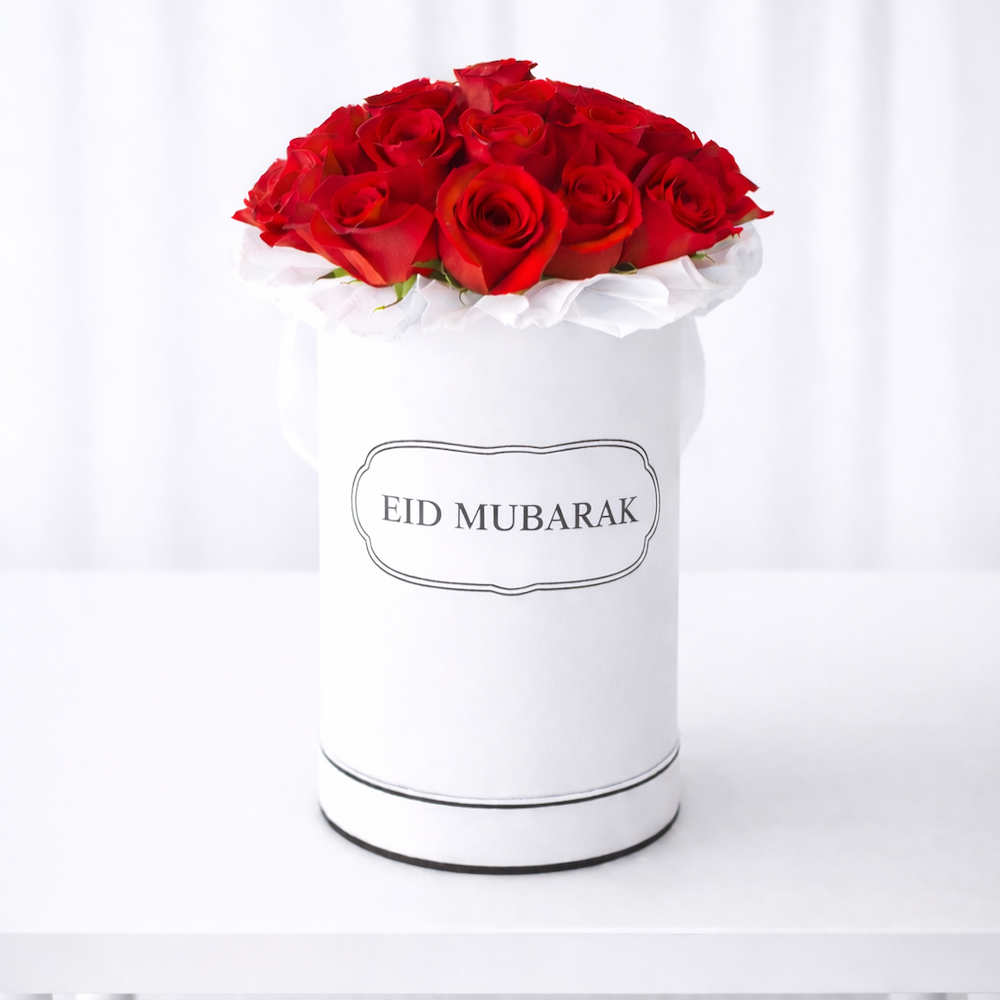 Fresh red roses beautifully arranged in an elegant white round box, specially designed for Eid celebrations, this standard size arrangement includes 30 red roses, creating a full and luxurious look that perfectly expresses joy and warm wishes for Eid. the box can be customized with an Eid greeting or name, making it a thoughtful and elegant gift for family and loved ones.