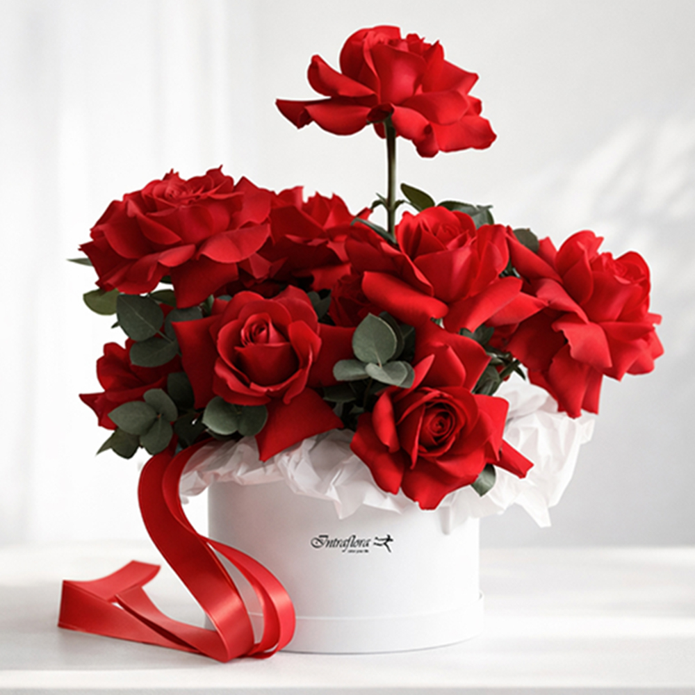 A bouquet containing red roses, arranged beautifully.
