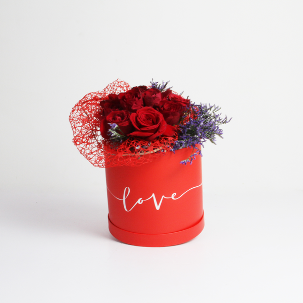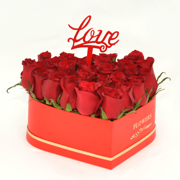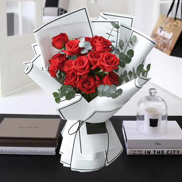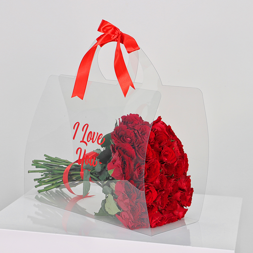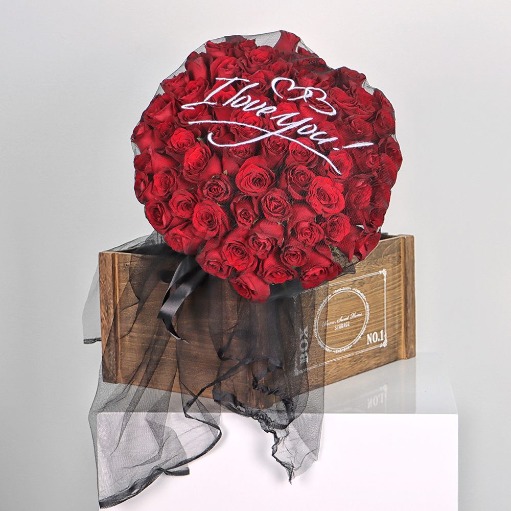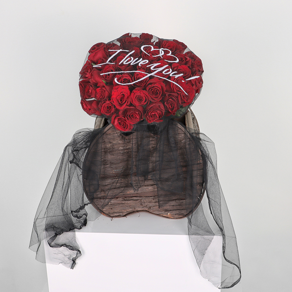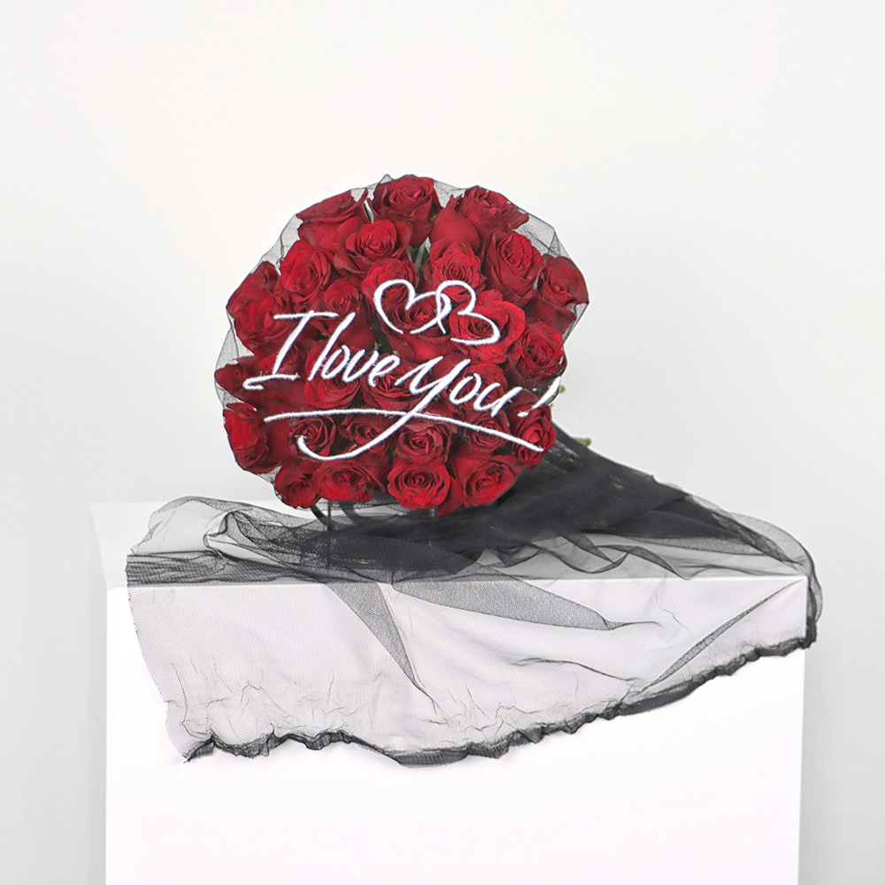 A red rose bouquet of 50 roses wrapped in embroidered tulle. "I love you".