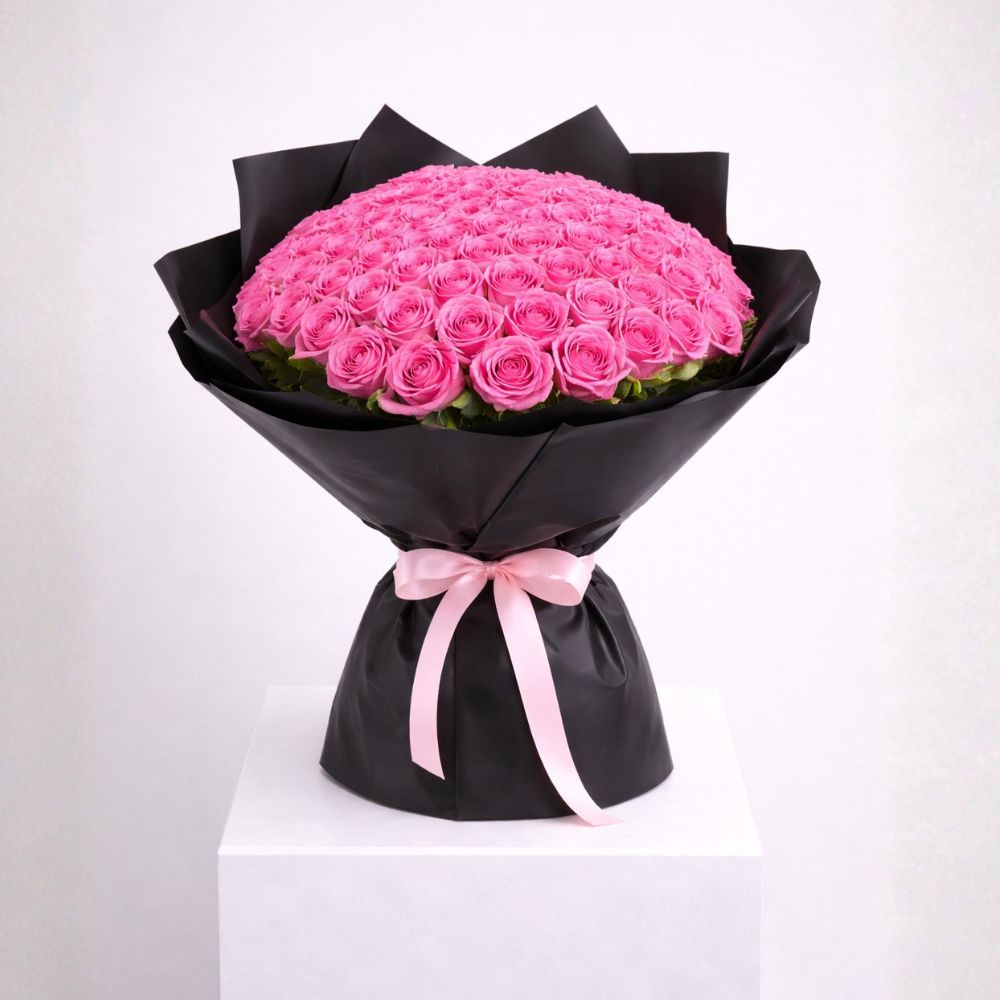 A hand bouquet containing 61 pink roses, arranged beautifully in luxurious black wrapping.
