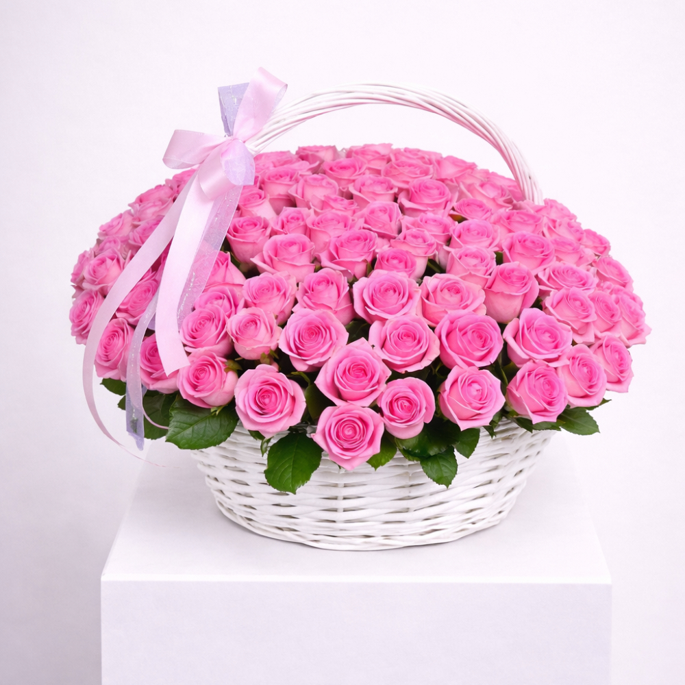 A bouquet of 51 stems pink roses with a basket and ribbon.