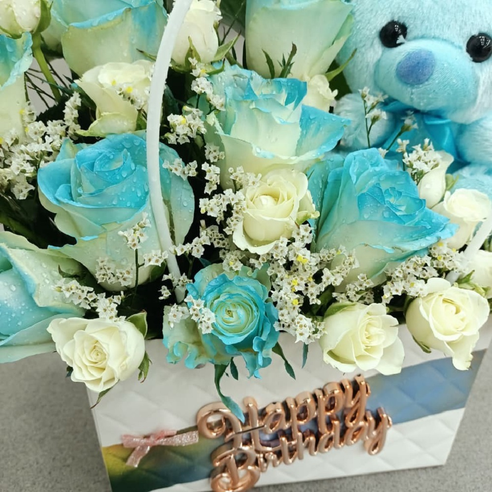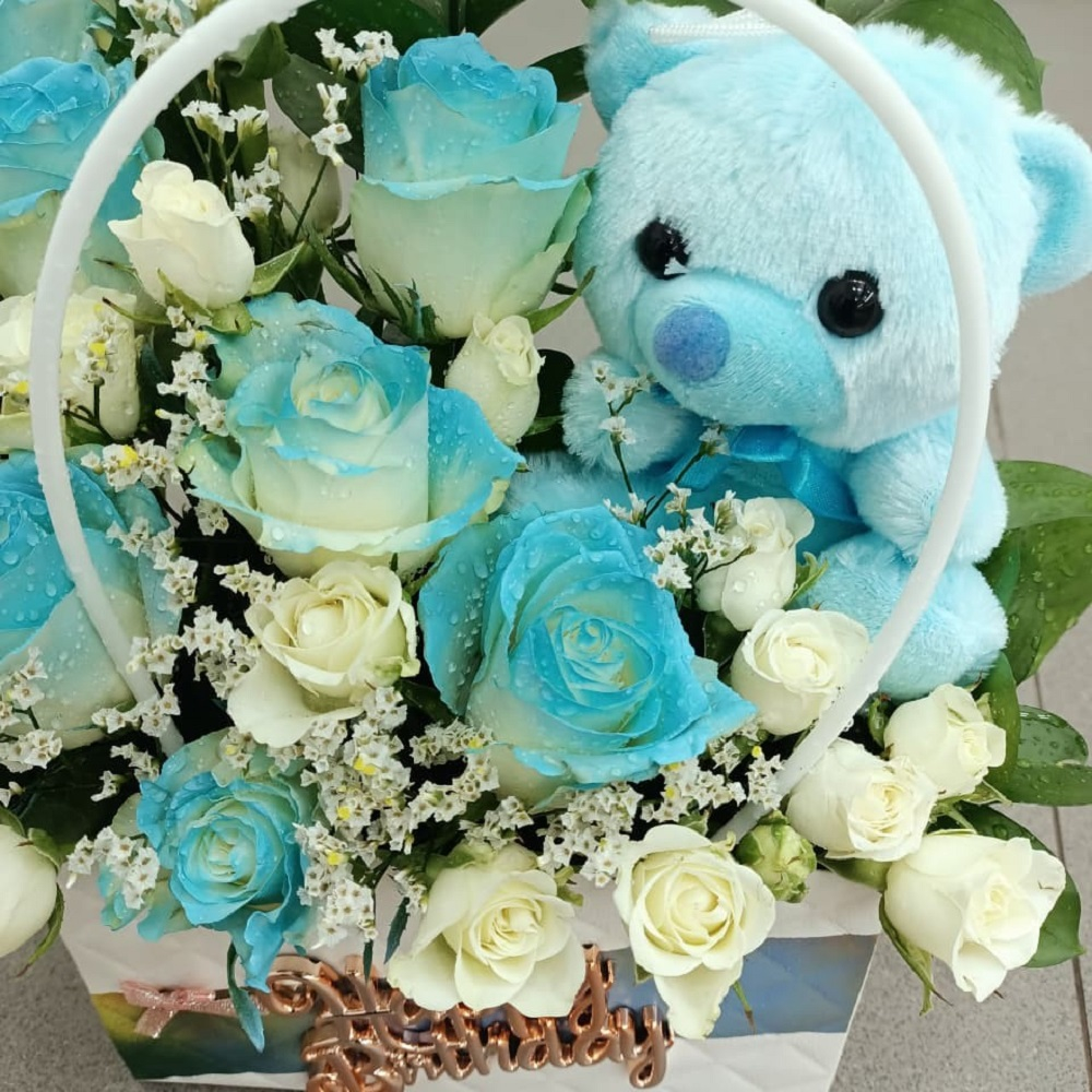 An elegant basket featuring blue and white roses flowers with an adorable blue teddy bear, perfect for birthday surprises and heartfelt celebrations.
