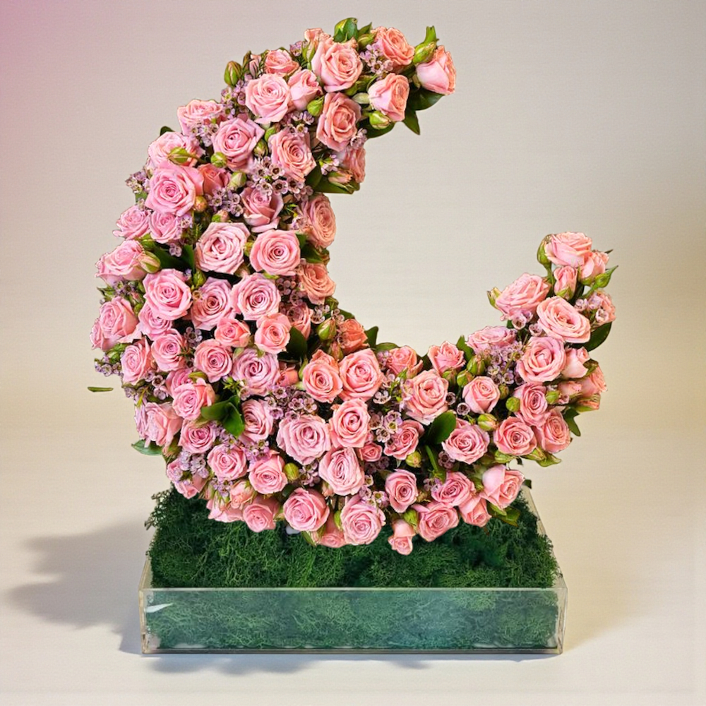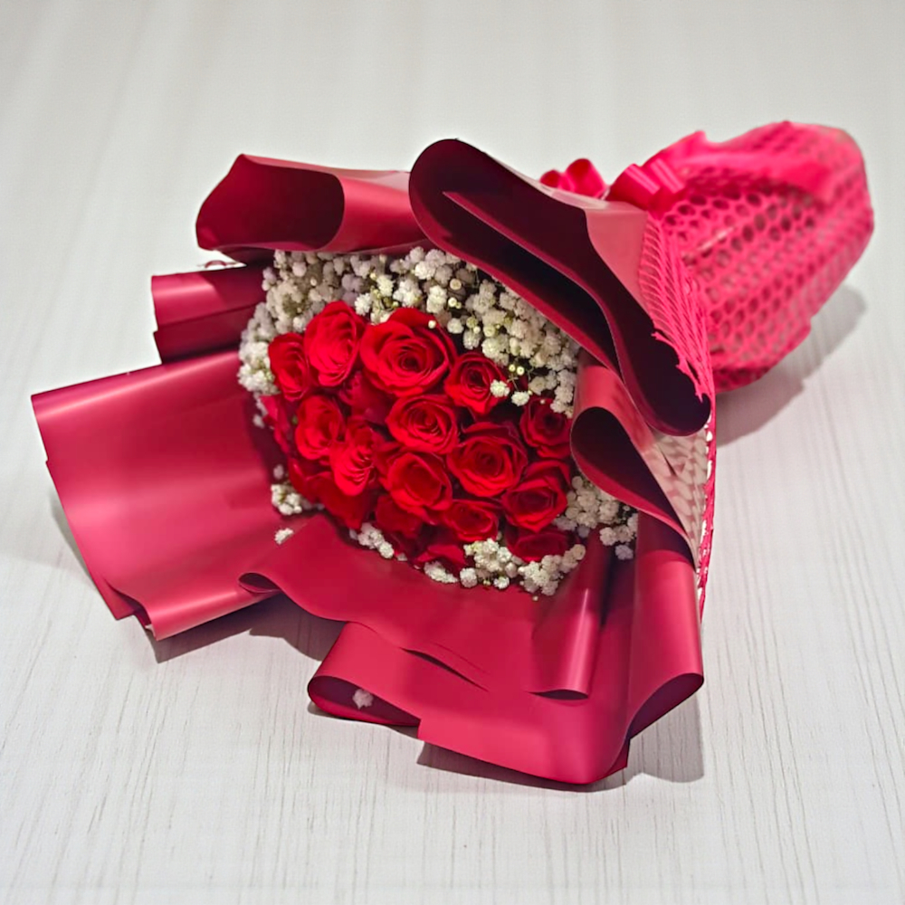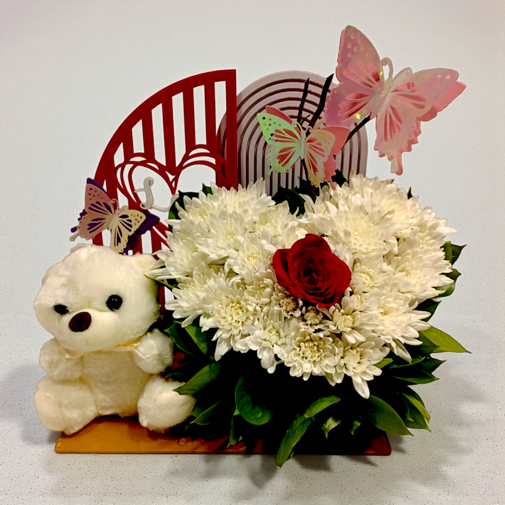 A delightful and festive gift set featuring a lush heart shaped cluster of creamy white chrysanthemums centered with a single, vibrant red rose. The arrangement is playfully decorated with colorful butterfly toppers and set against a backdrop of arched decorative panels. Accompanied by a cuddly white teddy bear, this whimsical display is presented on a wooden base, making it a perfect gift for birthdays, newborns, or a sweet surprise.