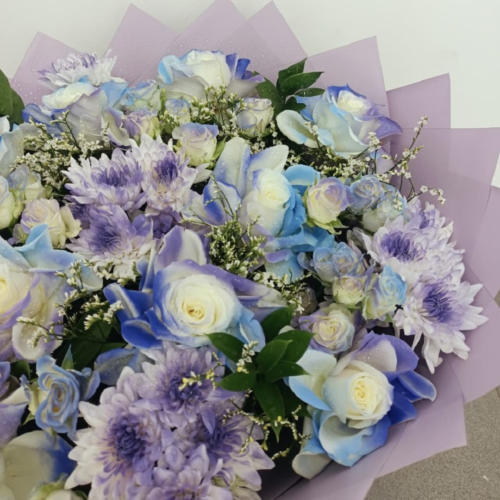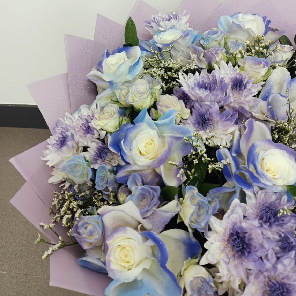An elegant bouquet featuring pastel blue and purple rose flowers with delicate lavender chrysanthemum flowers, wrapped in pale lilac paper for an elegant, and ethereal look.