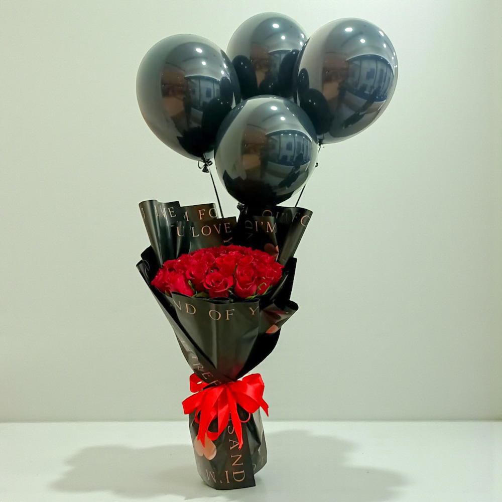 A sophisticated and dramatic bouquet featuring a dense cluster of vibrant red roses wrapped in premium black typography paper. The design is elevated by 4 glossy black balloons and finished with a classic red ribbon, creating a luxurious contrast that is ideal for anniversaries or romantic surprises.