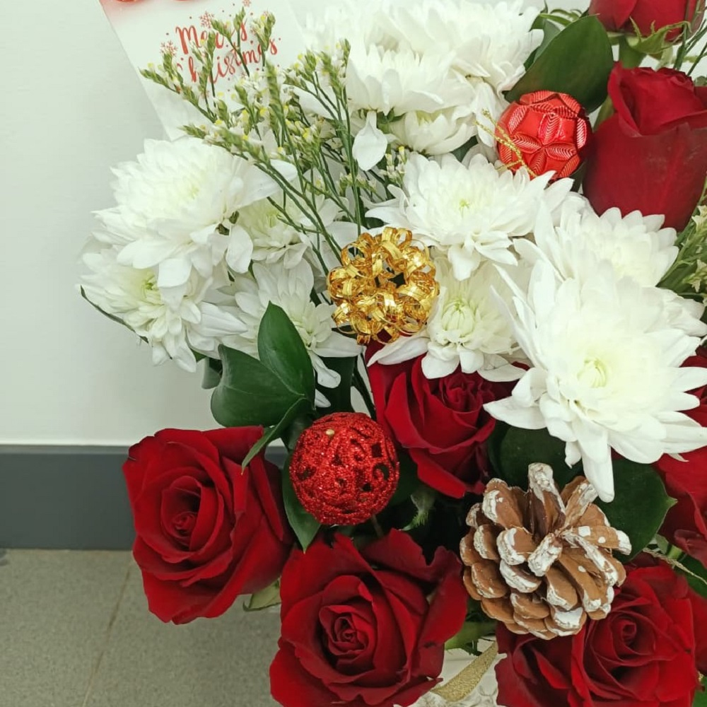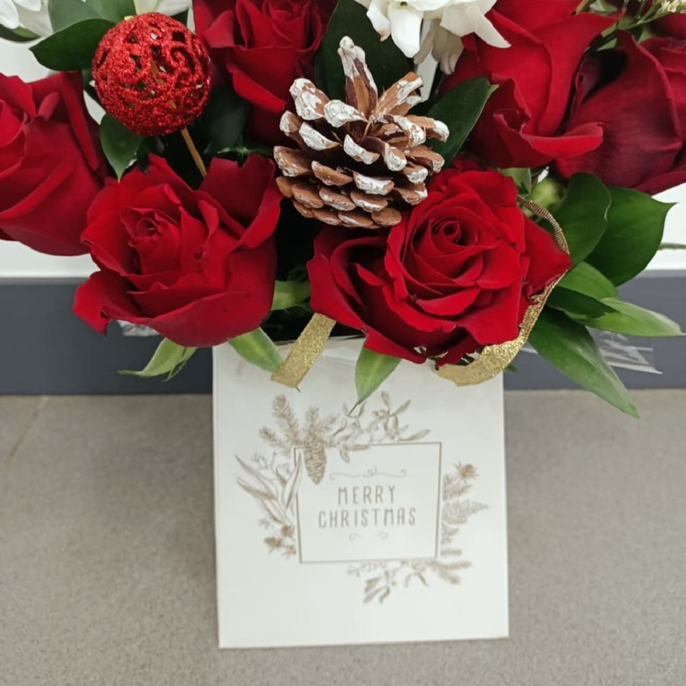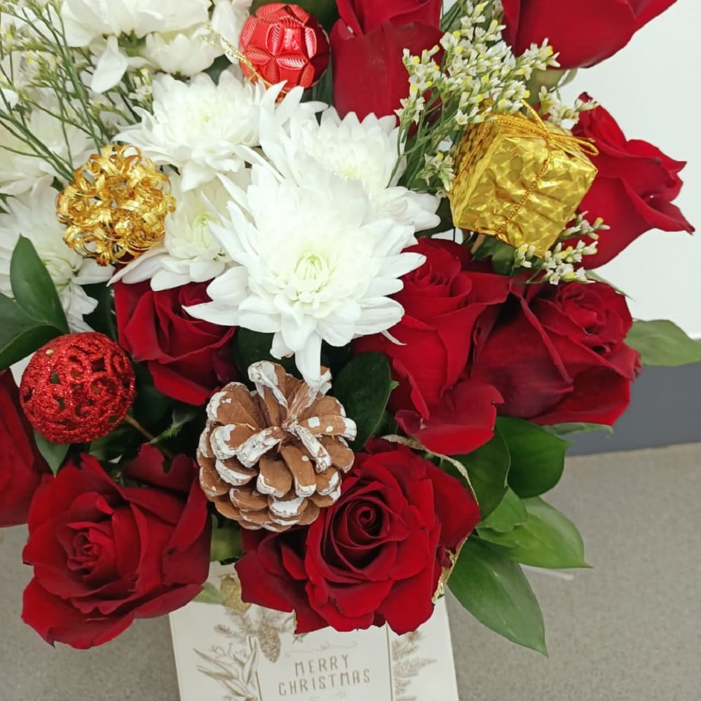 A charming holiday gift box arrangement overflowing with vibrant red roses and snow white chrysanthemums, this set is uniquely detailed with rustic pinecones, festive baubles, and a miniature gold gift box, all nestled inside a decorative "Merry Christmas" tote for a cozy, heartwarming presentation.