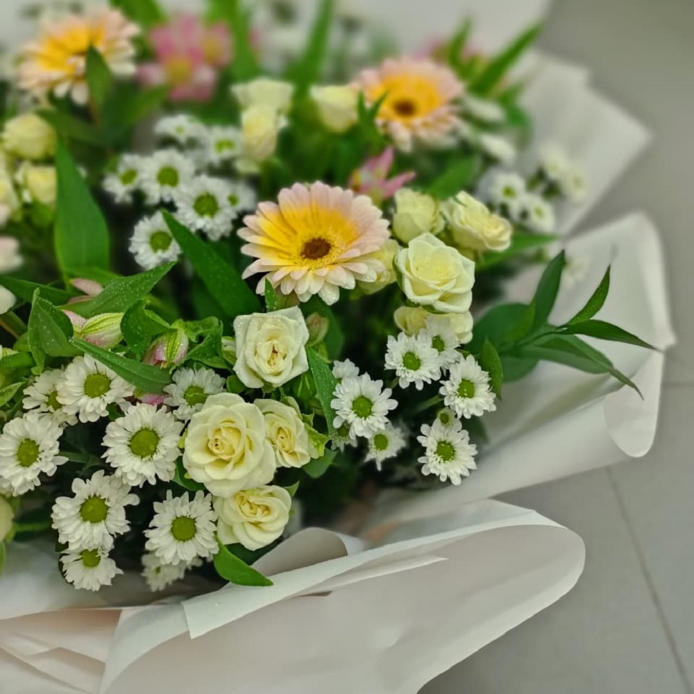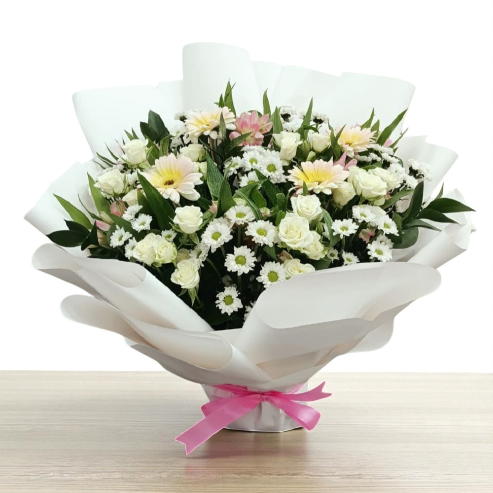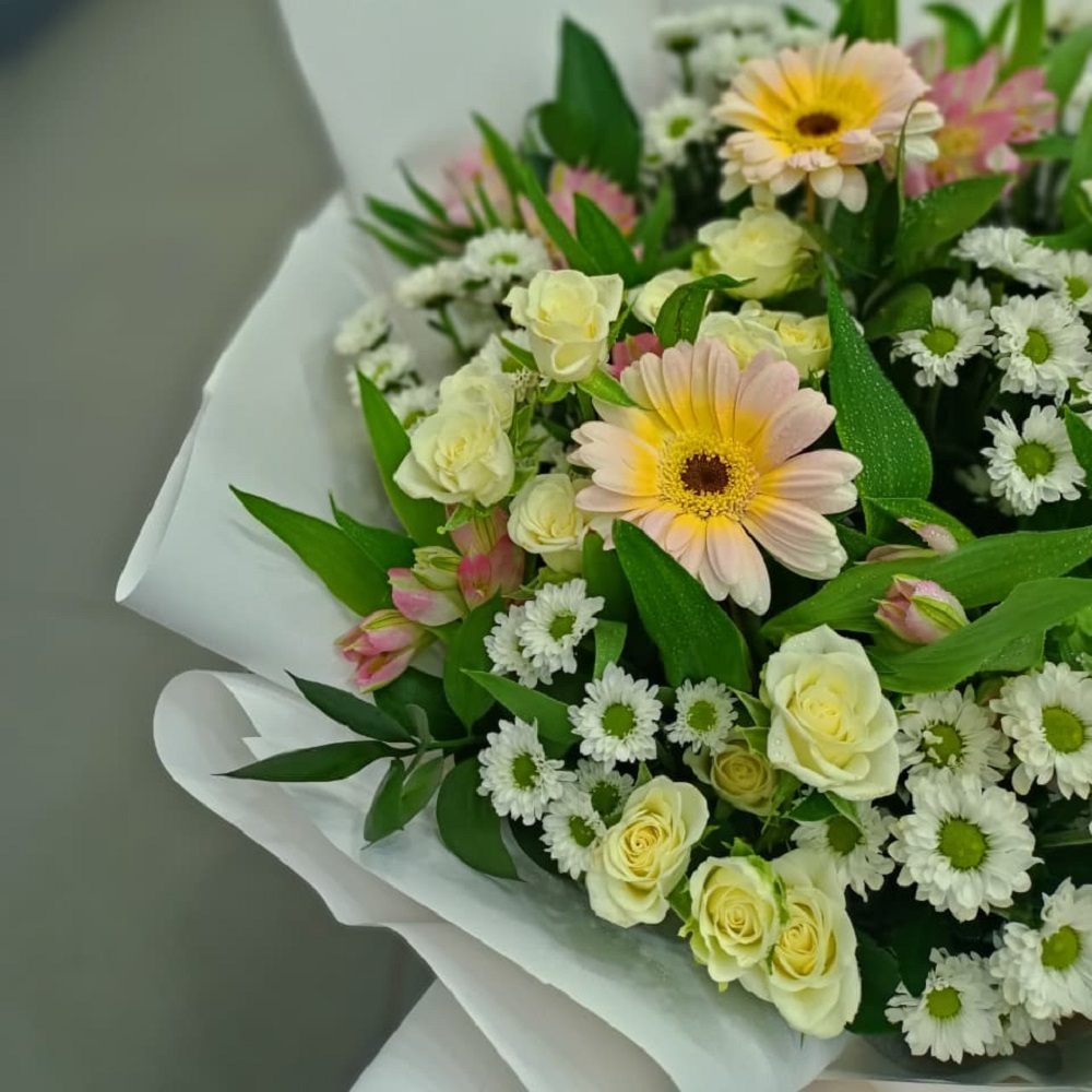 A hand bouquet that contains roses, gerberas, alstroemerias and daisies.